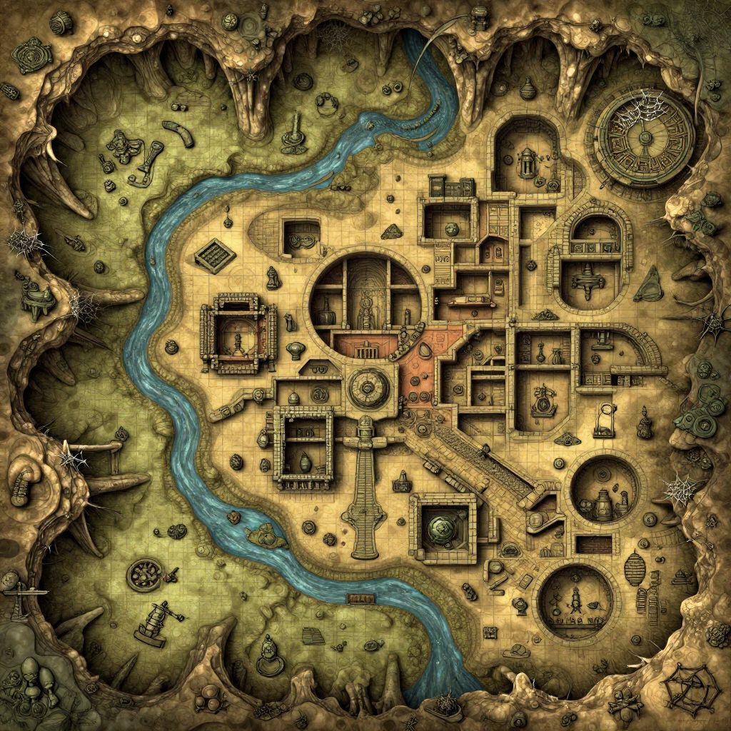 Vast underground DnD map representing a complex network of natural caves and manmade dungeon chambers scattered with ancient relics, spider webs, subterranean rivers flowing through dry stone corridors, fantasy cartography style with clear grid lines and thematic color coding.