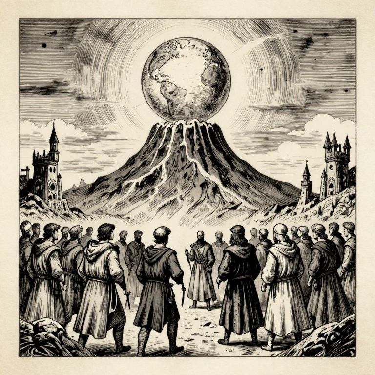 Volcano a crowd of medieval citizens gathering before a giant orb in the sky, ink drawing on parchment, gothic fantasy,