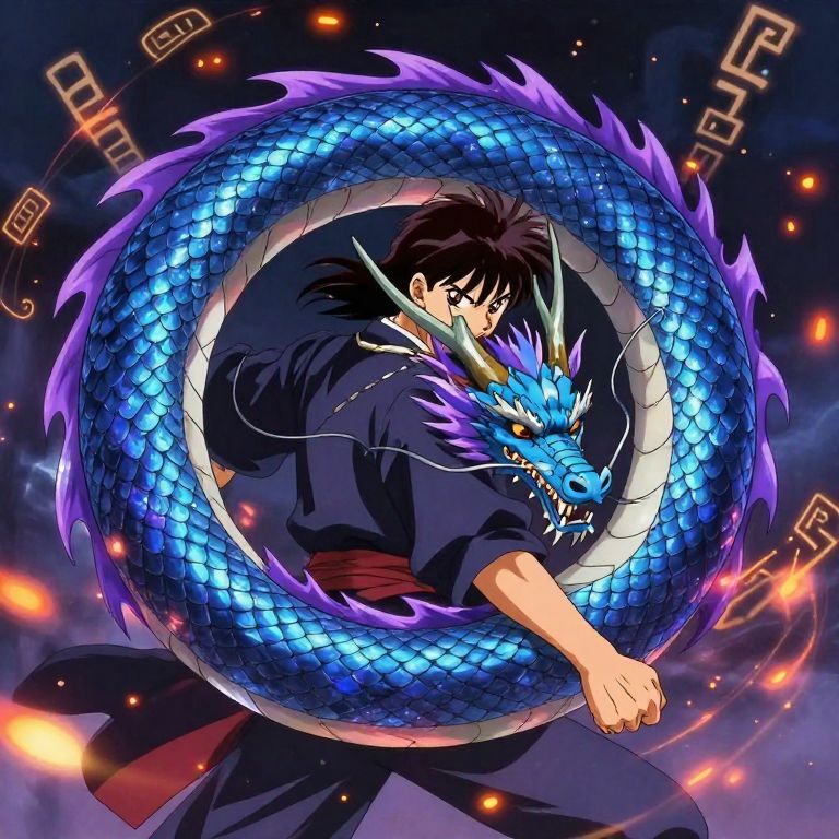 Anime depiction of a dragon tail wrapped around a warrior’s arm, scales glistening with iridescent blues and purples, surrounded by floating embers and swirling magical glyphs, dynamic pose with detailed textures and atmospheric depth, classic anime aesthetic.