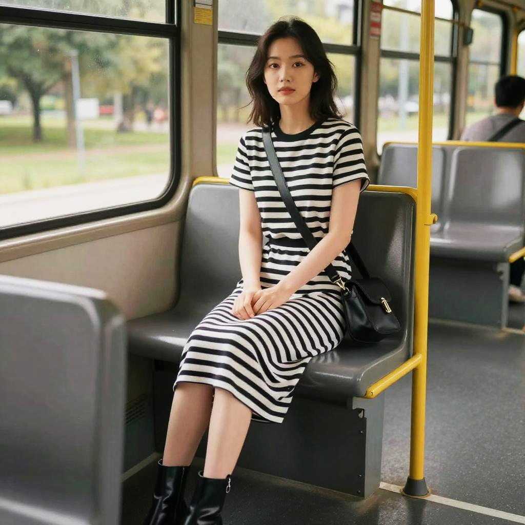 A woman, in a modern casual horizontal black and white striped midi dress with short sleeves, black crossbody bag, and ankle boots, enjoying a tram ride through the park, in the visual style of Mappa Studio. Sexy. Pretty face and beutiful eyes