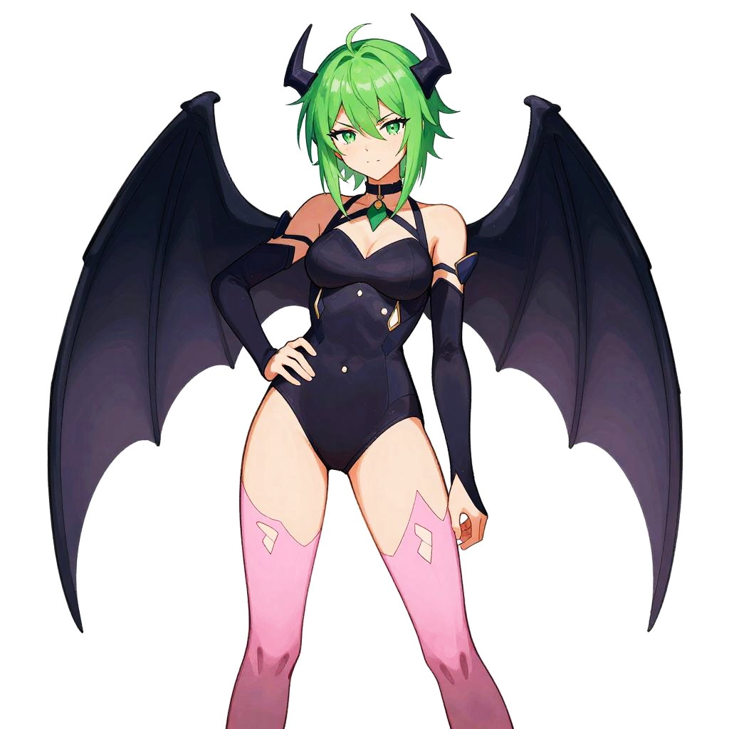 This is a digital drawing of an anime-style female demon character. She has long, wavy teal hair, bat-like wings, and small horns. She's wearing a tight, black and purple bodysuit that highlights her curvy figure. Her right arm is raised with a clawed hand, while her left hand rests on her chest. The background is plain white, making her vibrant colors pop. The style is colorful and slightly glowing, with a fantasy vibe.