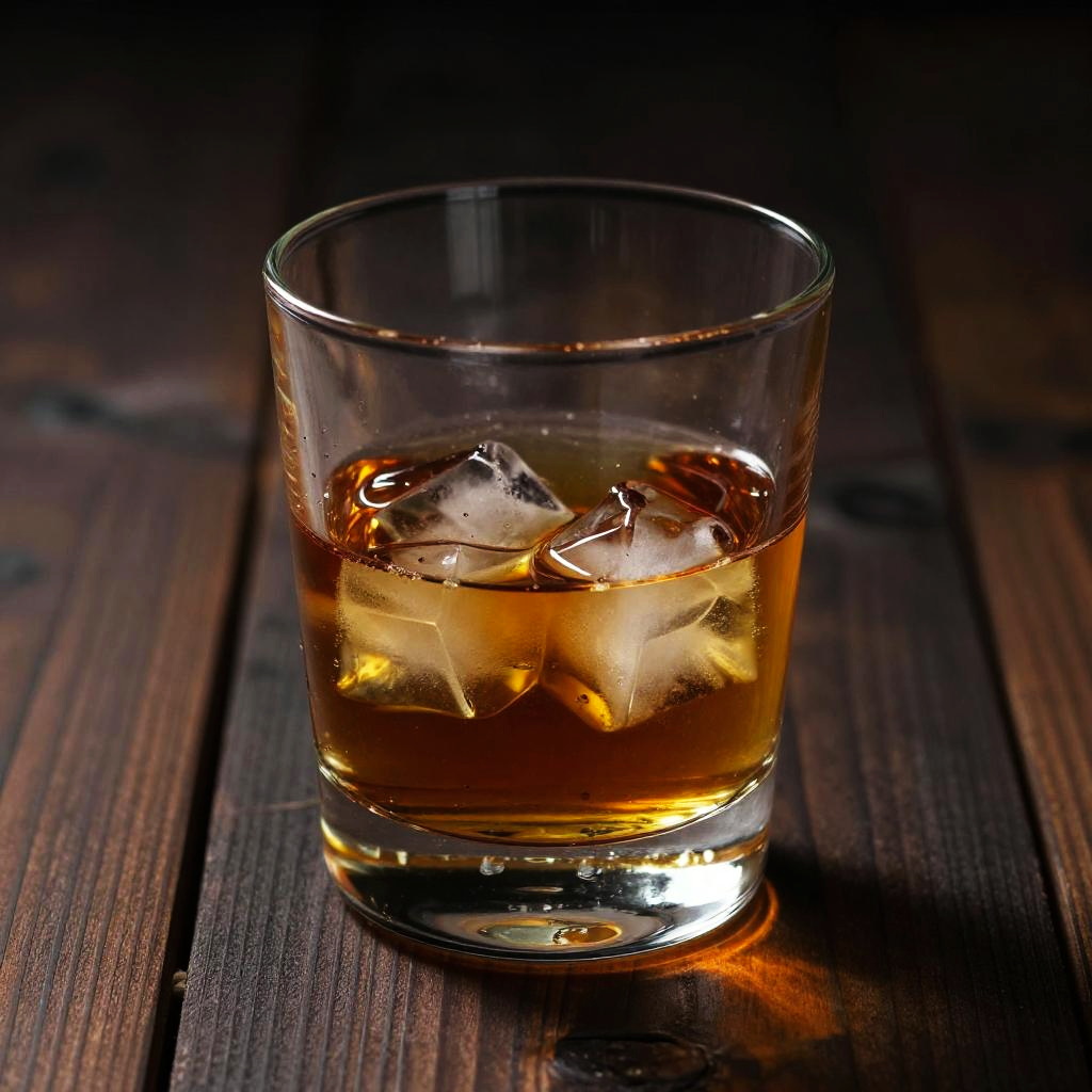 A high-contrast photo of a classic cocktail glass filled with dark brown liquid, possibly cola, and large, transparent ice cubes. The glass has a wide, rounded rim and a short, sturdy base. The background is stark white, making the dark liquid and ice cubes stand out. The image has a slightly gritty texture, giving it a raw, unfiltered look.