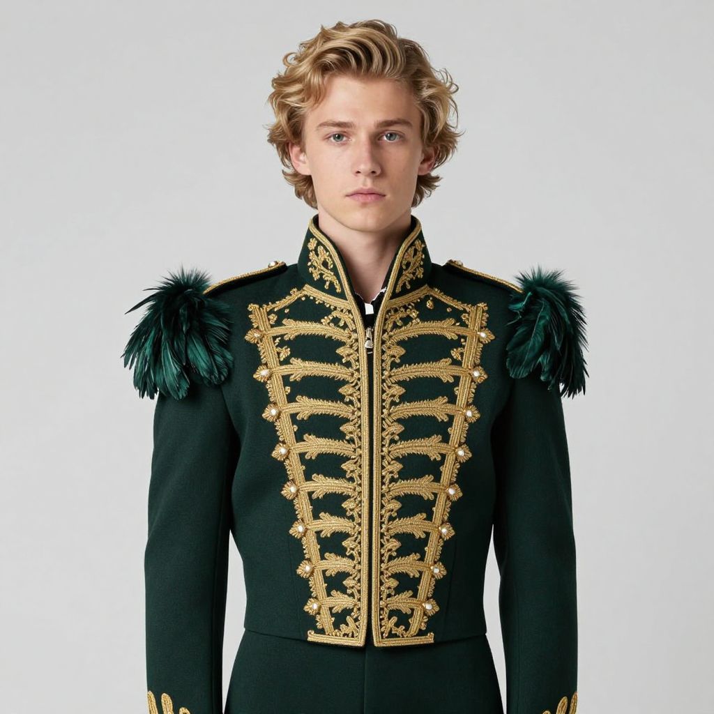 Photograph of a young blond man with wavy hair, standing against a plain light gray background. He's wearing an elaborate, dark green military-style jacket with intricate gold embroidery running down the center. The jacket features large, dark green feathered shoulders. His expression is neutral, and he's looking directly at the camera. The overall style is formal and regal.