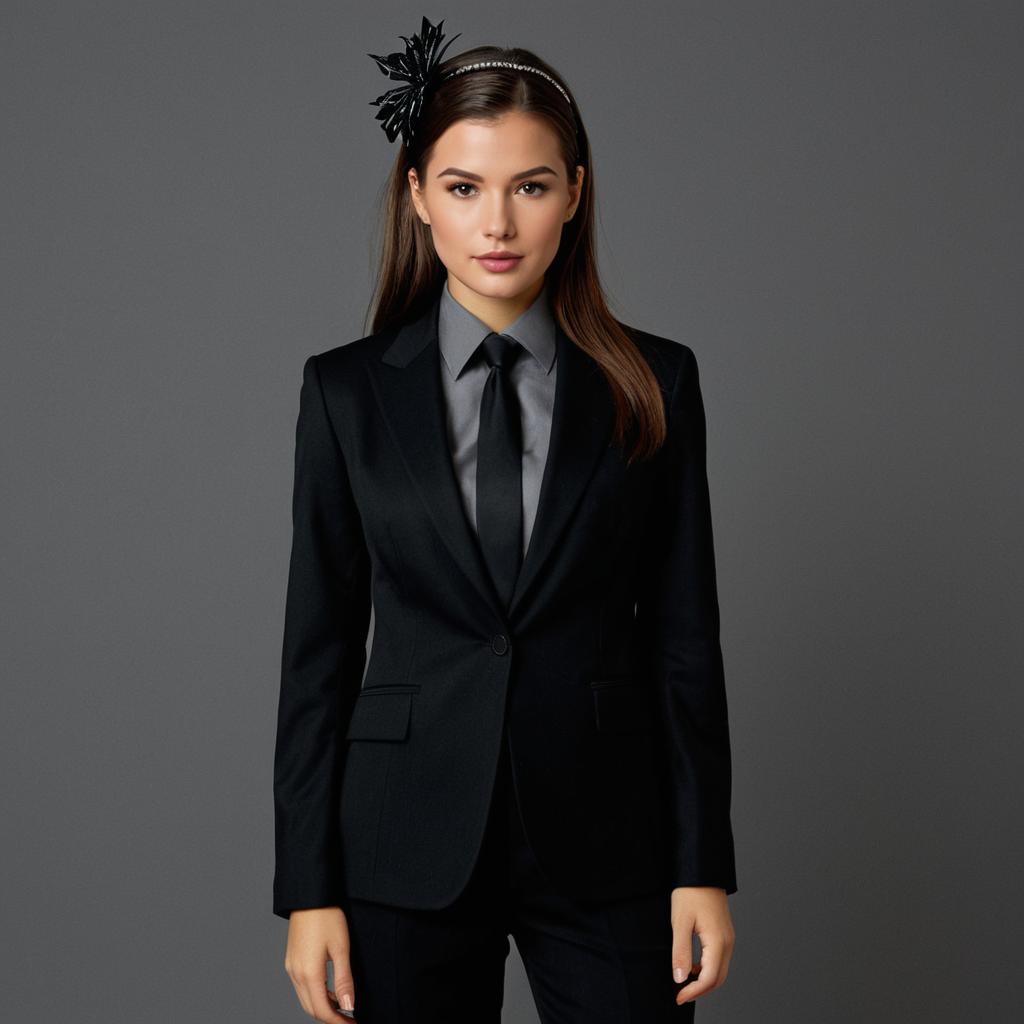 Portrait of a young woman with brown hair and brown eyes wearing a formal all-black Halloween suit with matching black pants and jacket over a gray shirt and black tie. She has a black shiny hairclip and a headband, standing against a plain gray background.