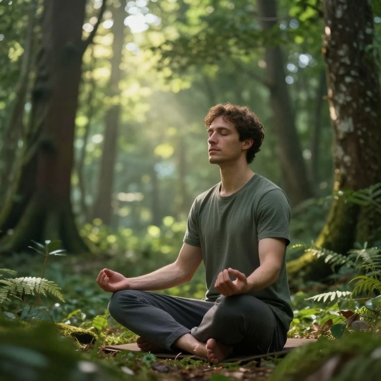 Mentally focused individual meditating in a serene forest, soft glowing light filtering through tall trees, peaceful expression, vibrant greenery, detailed textures, calming atmosphere, highly detailed digital art.