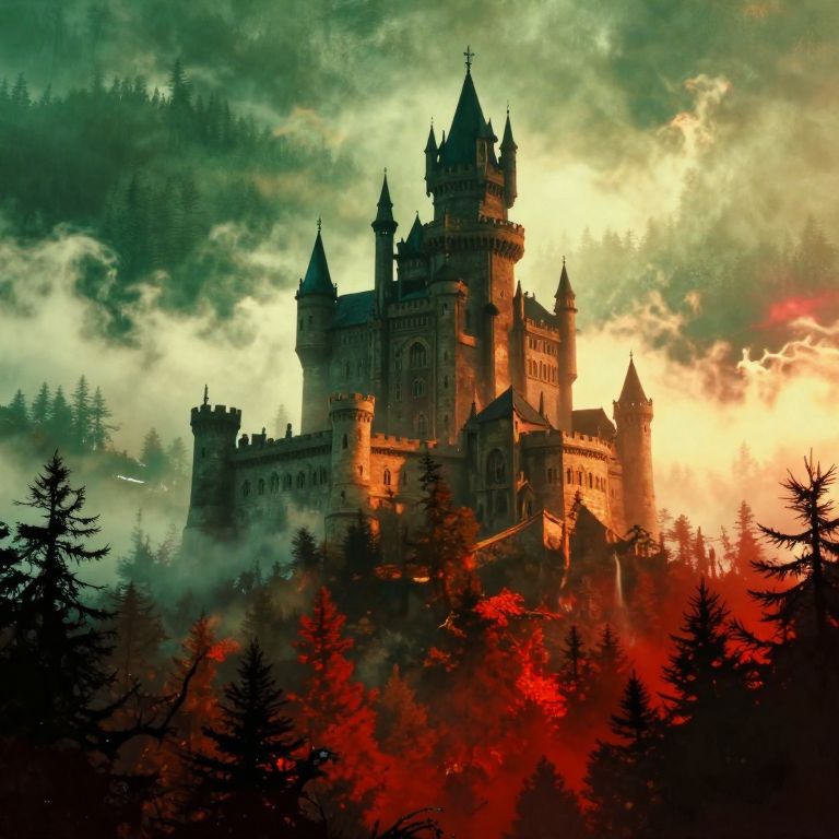 Photograph-style digital artwork of a gothic-style castle with multiple tall, pointed towers and turrets, bathed in a dramatic, fiery sunset light. The castle, positioned slightly to the right, is surrounded by dense, dark green pine trees in the foreground. Red and orange hues dominate the lower part of the image, contrasting with the green and yellow clouds in the sky. The castle's stone walls are dark and textured, enhancing its medieval appearance. The overall scene evokes a sense of mystery and fantasy, with a dramatic, almost surreal color palette.