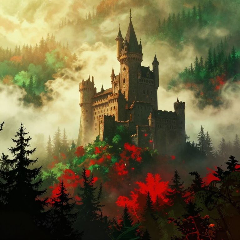 A stunning, vibrant cinematic photograph of a mysterious old castle in the mist-shrouded foothills of a mystical forest, fantasy art that evokes a sense of high-stakes drama in the style of Image's comic book photography, photo-realistic textures and film grains immerse the viewer in the scene, bathed in warm, golden light dotted with emerald greens and crimson reds, as if the forest itself were ablaze, the Ethereal clouds surround the forest, capturing the intensity of the fight for survival