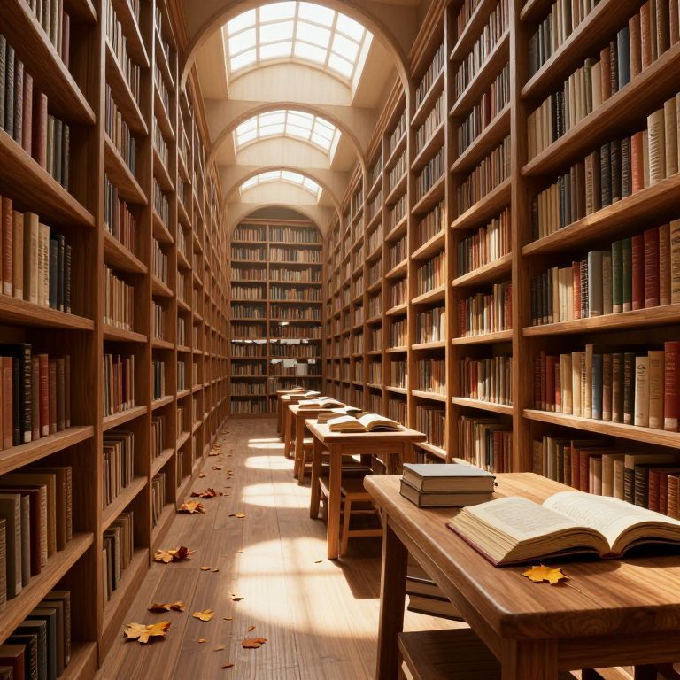 An atmospheric 3D-rendered library scene features endless rows of wooden shelves stretching into the distance, illuminated by natural light streaming through arched skylights, creating a dramatic interplay of shadows and highlights, while scattered autumn leaves and open books on tables evoke a sense of forgotten knowledge and timeless exploration.