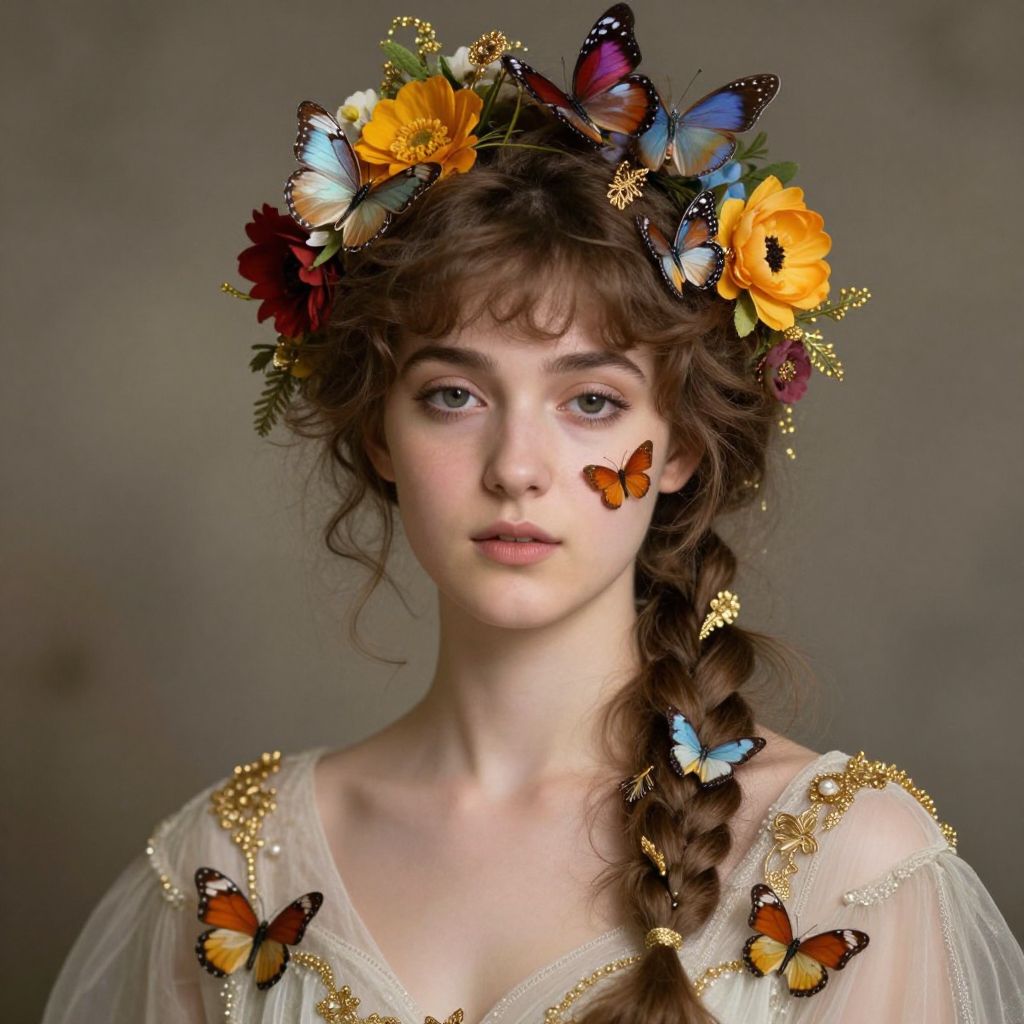 A digital artwork inspired by Victorian portraiture, featuring a serene young woman adorned with delicate butterflies, vibrant flowers, and intricate gold embellishments, evoking the ethereal charm of Sophie Gengembre Anderson's 1869 masterpiece.