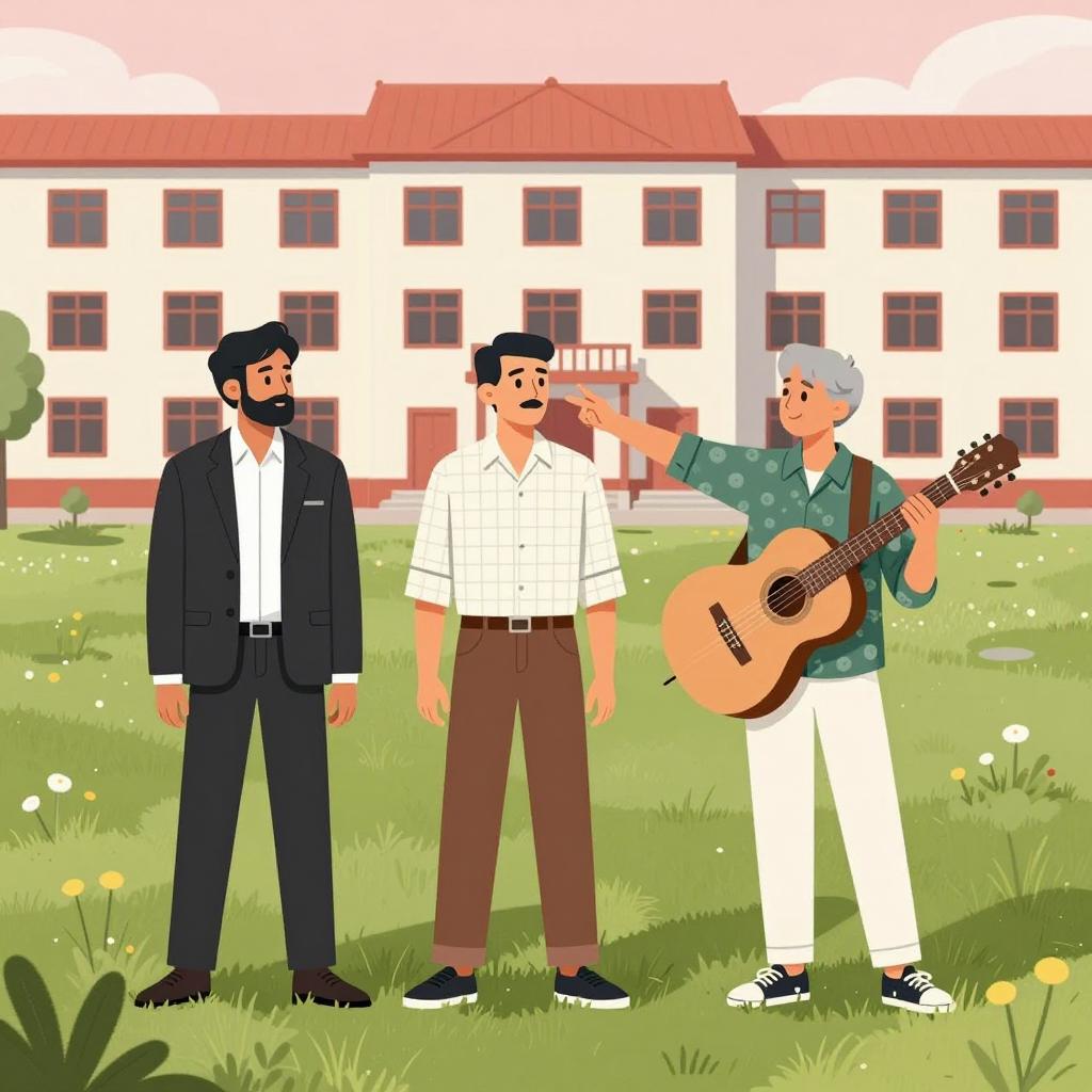 Digital illustration of three men standing on a grassy field in front of a multi-story red and white building. The man on the left has dark hair, beard, and is dressed in a black suit with a white shirt. The man in the center has short hair, a mustache, and wears a light checkered shirt paired with brown pants. The man on the right has short gray hair, is wearing a green patterned shirt and white pants, and is holding a guitar while gesturing towards the central man. The scene features a pink sky and small yellow flowers in the grass.