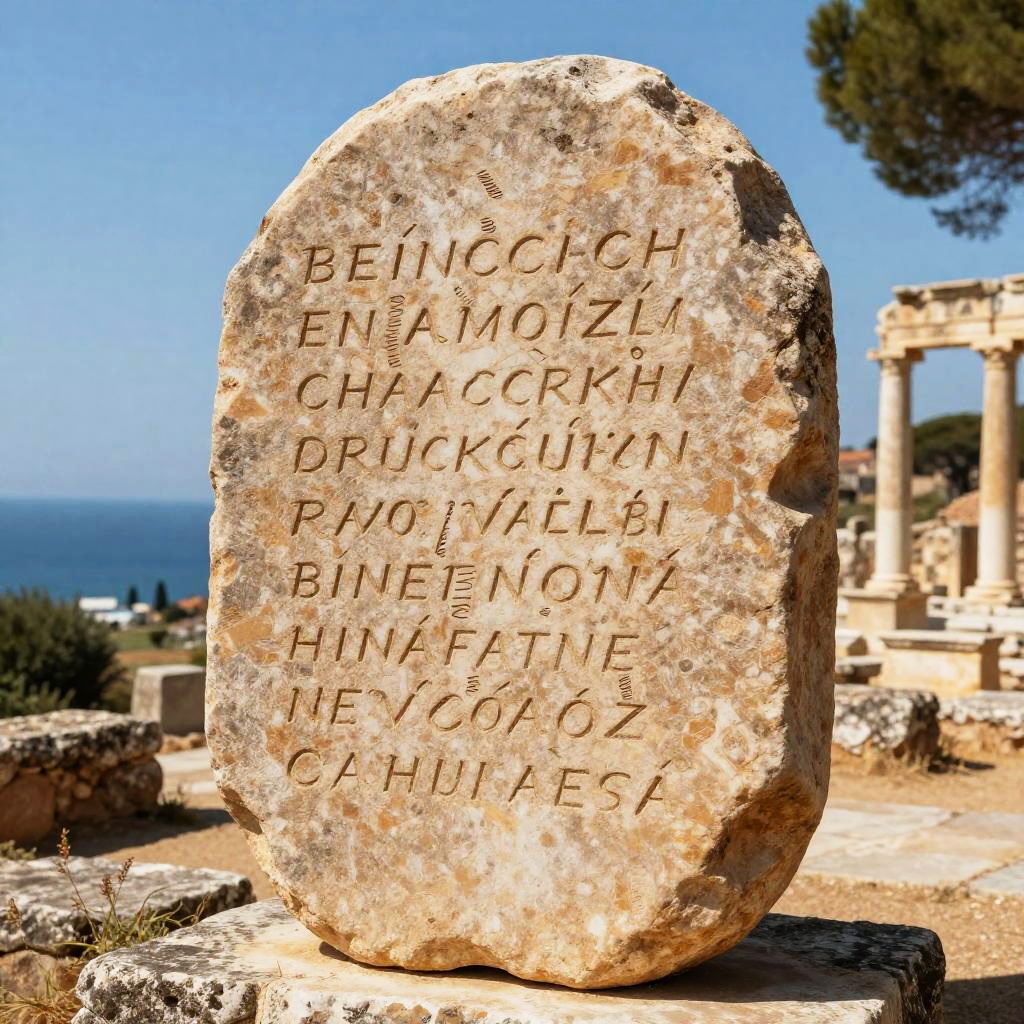 Iberian Peninsula language script illustrated on ancient stone tablets, surrounded by Mediterranean landscape, sunlit historical ruins in warm tones, detailed handwriting style