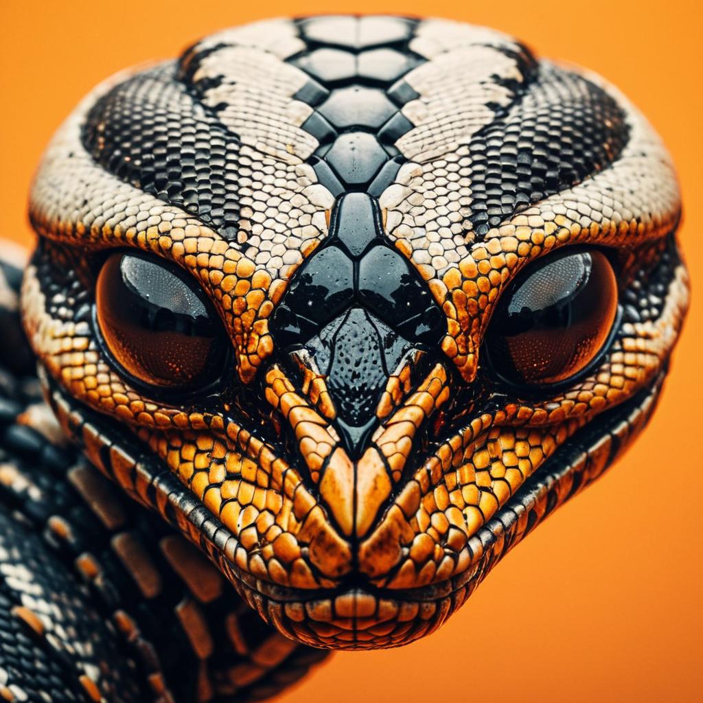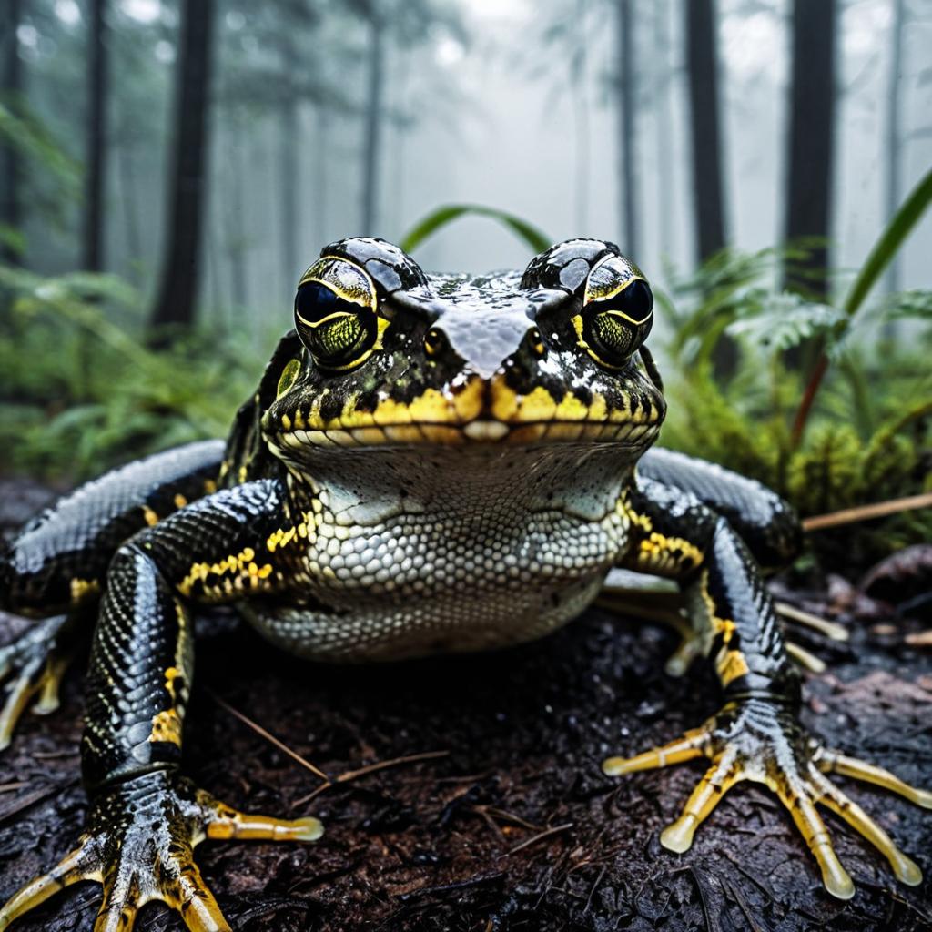 A hyperrealistic close-up portrait of a snake skin frog on wet soil in a misty forest. The frog features glossy black and yellow patterned skin with textured details, sitting amidst blurred green ferns and tall tree trunks in the foggy background. The image highlights the frog's large eyes and distinctive skin texture with high definition clarity.