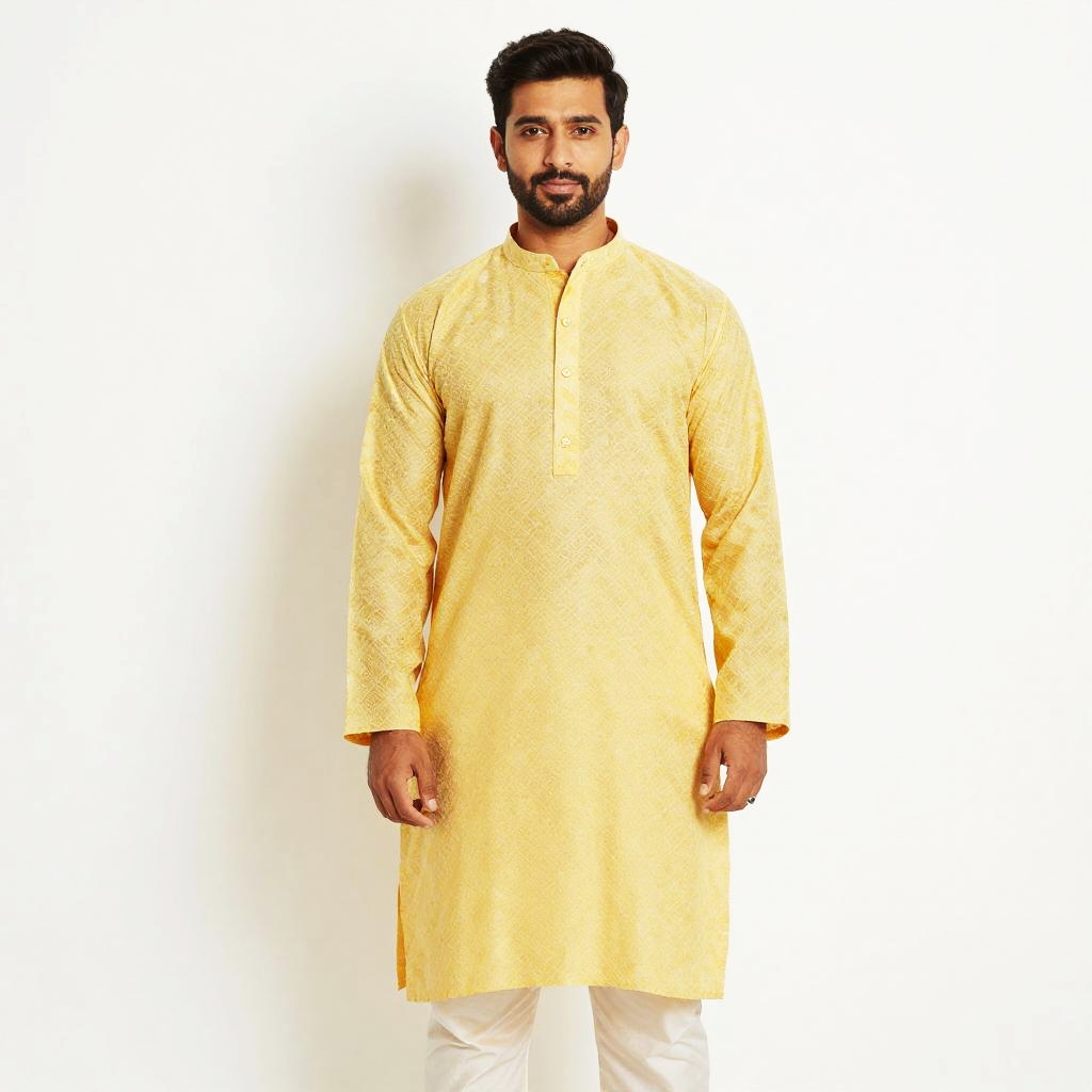 Style Kurta Pajama Costume, a man in a yellow kurta stands in front of a white wall
