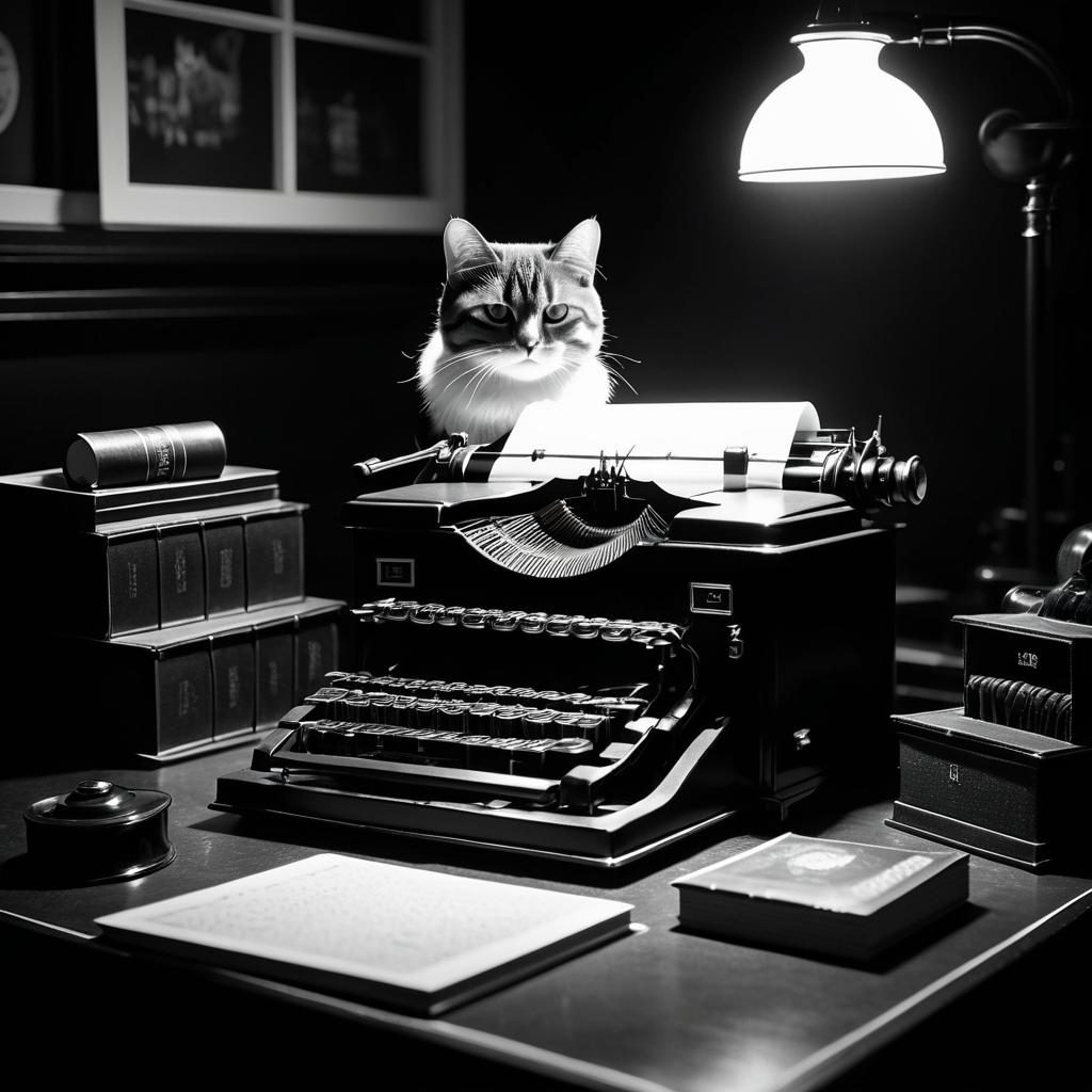 Black and white photo of a tabby and white cat sitting at a desk with a vintage typewriter in a dark, 1920s-style room. The scene is illuminated by a soft table lamp creating a noir atmosphere with detailed film grain. Books and framed pictures provide a classic literary setting.