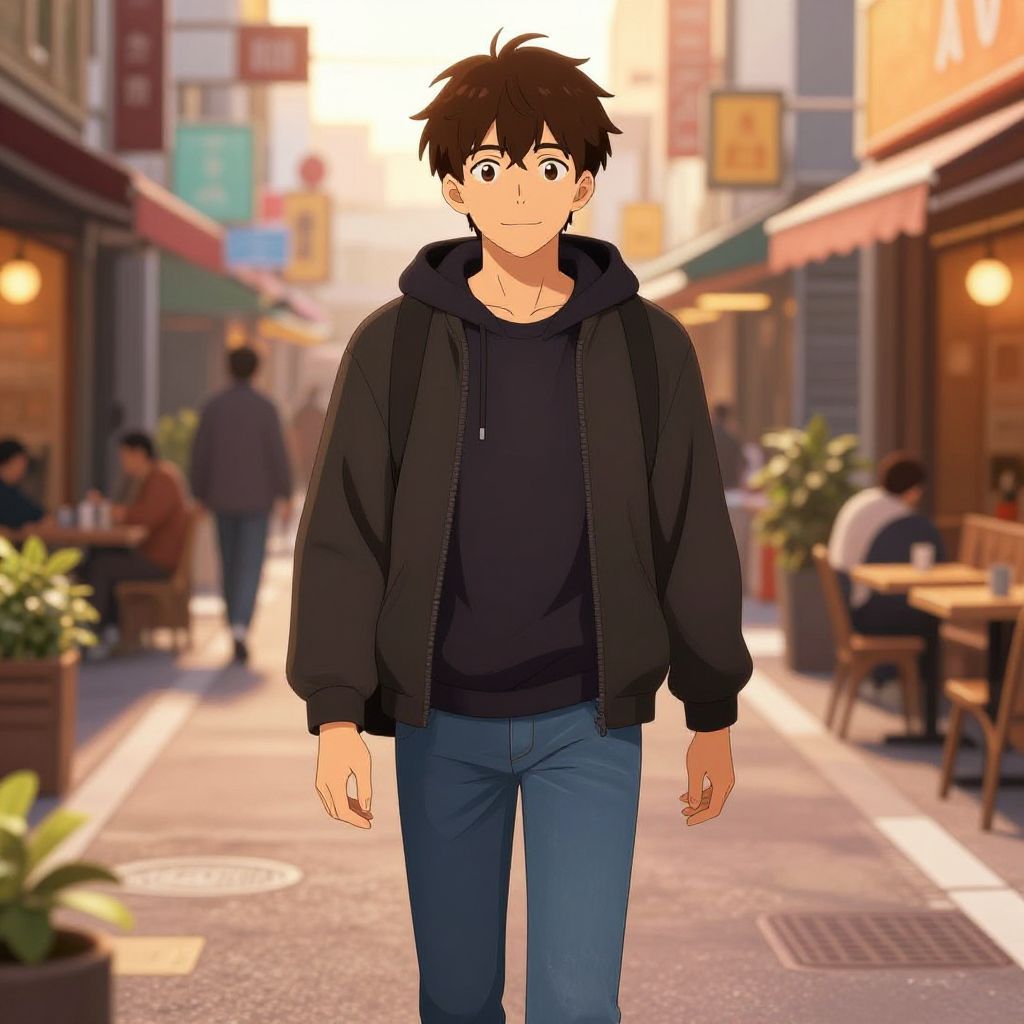 Anime-style digital drawing of a young, blushing boy with brown hair, wearing a black hoodie and backpack, standing in a brightly lit, blurry urban