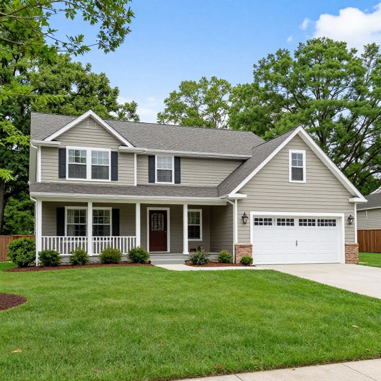 Cozy two-story ranch-style home featuring 1,024 square feet of living space, with a welcoming front porch, double garage, and lush landscaping including green lawns, shrubs, and tall trees surrounding the property.