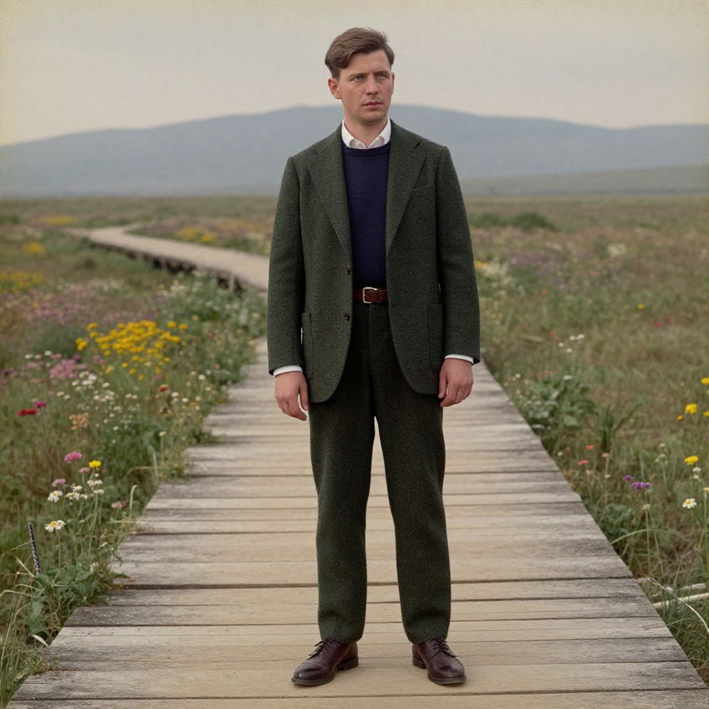 Photograph of a young Caucasian man with short brown hair standing on a wooden pathway in a grassy meadow. He wears a dark green tweed suit with a white shirt, blue sweater, and brown leather shoes. The background features a blurred mountain range under an overcast sky. The pathway is lined with various wildflowers, including yellow and pink blooms. The man's expression is neutral, and he stands with his hands by his sides. The image has a slightly vintage, soft-focus effect, adding a nostalgic feel.