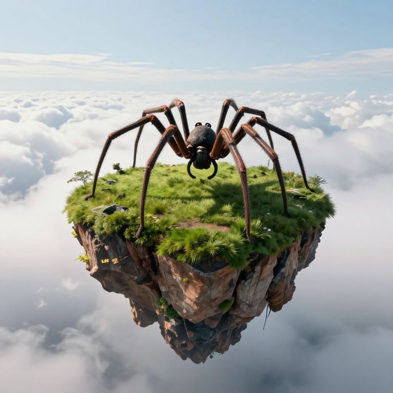 Giant spider perched atop a verdant, heart-shaped floating island suspended above a sea of fluffy white clouds, its long legs dangling down as if anchoring the surreal landscape to the ethereal sky.
