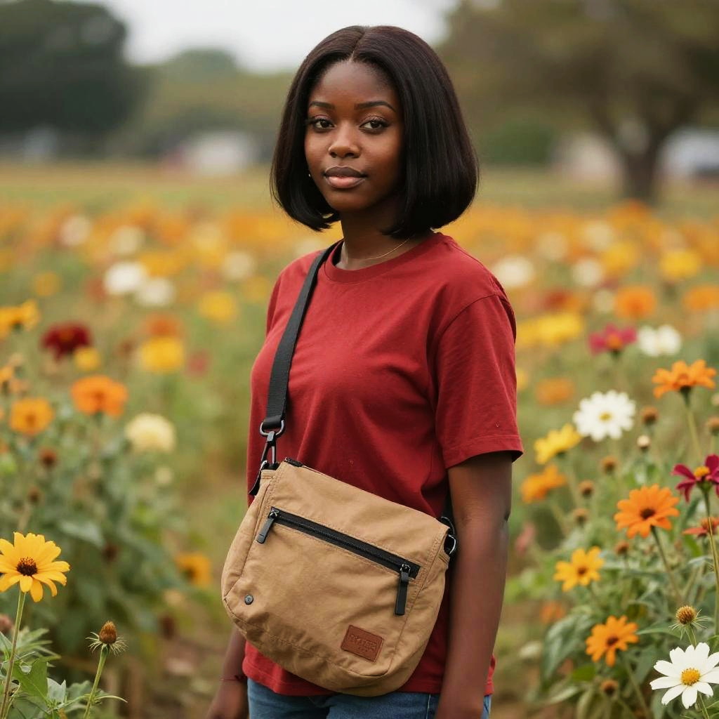Bob, black girl with red shirt and messenger bag standing in a field of flowers