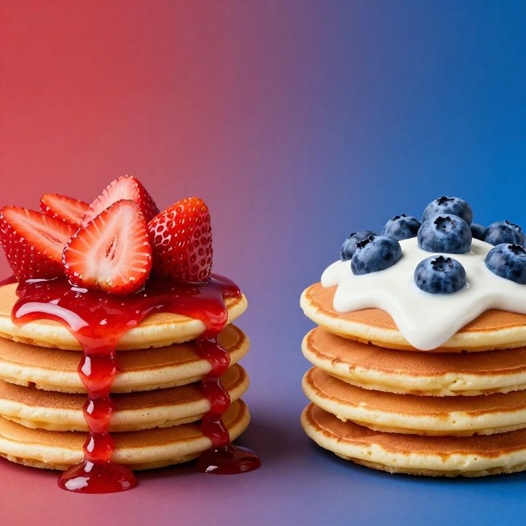 The image presents a vibrant and appetizing scene of two stacks of pancakes, each adorned with a different fruit topping. On the left side, a stack of golden-brown pancakes is generously covered with a glossy red strawberry sauce, topped with fresh, sliced strawberries that exhibit a bright red hue and a slightly glossy texture. The strawberries are arranged in a somewhat scattered manner, with some slices overlapping and others placed more prominently. To the right of the strawberry pancakes, another stack of pancakes is presented, this time topped with a creamy white yogurt-like substance and a sprinkling of fresh blueberries. The blueberries are dark blue with a slightly rough texture, and they are scattered across the pancakes in a more uniform distribution compared to the strawberries. The background is a gradient of warm red on the left and cool blue on the right, creating a striking contrast that highlights the colors of the fruits and the pancakes. The overall composition is balanced, with the two stacks of pancakes positioned side by side, each stack occupying roughly half of the image. The image invites a choice between the sweet, juicy strawberries and the tangy, creamy blueberries, offering a visual feast that appeals to both the eyes and the palate.