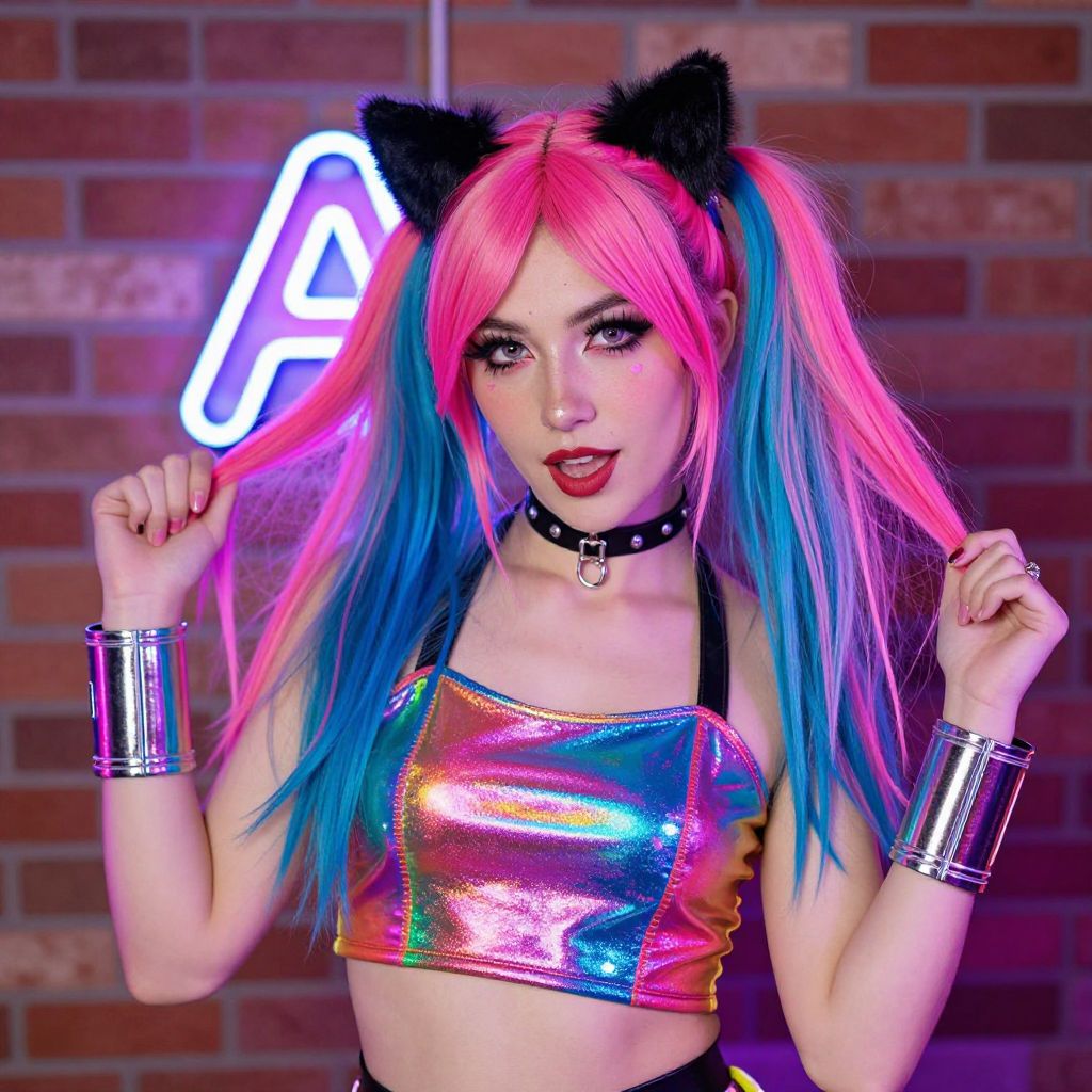 Photograph of a fair-skinned woman with neon pink and blue twin-tailed hair, wearing black cat ears and a shiny, multicolored crop top. She has bold makeup with heart-shaped eye accents, a black choker, and metallic arm cuffs. The background features a brick wall with a neon "A" sign. Her playful, edgy look is illuminated by colorful lighting, creating a vibrant, club-like atmosphere.
