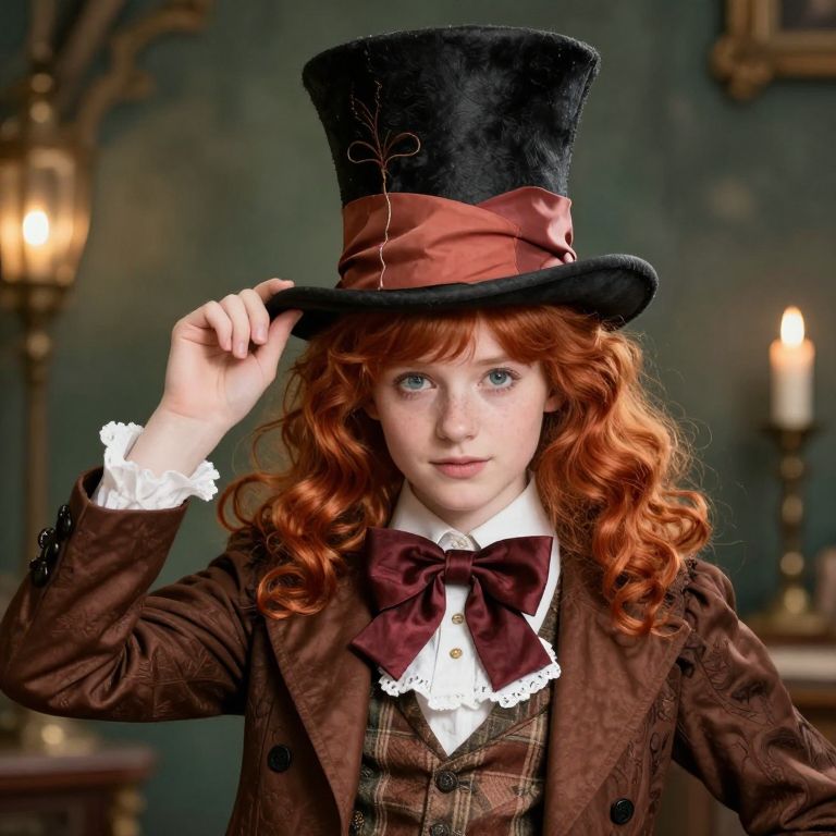 Boy Mad Hatter, young girl with red hair wearing a top hat