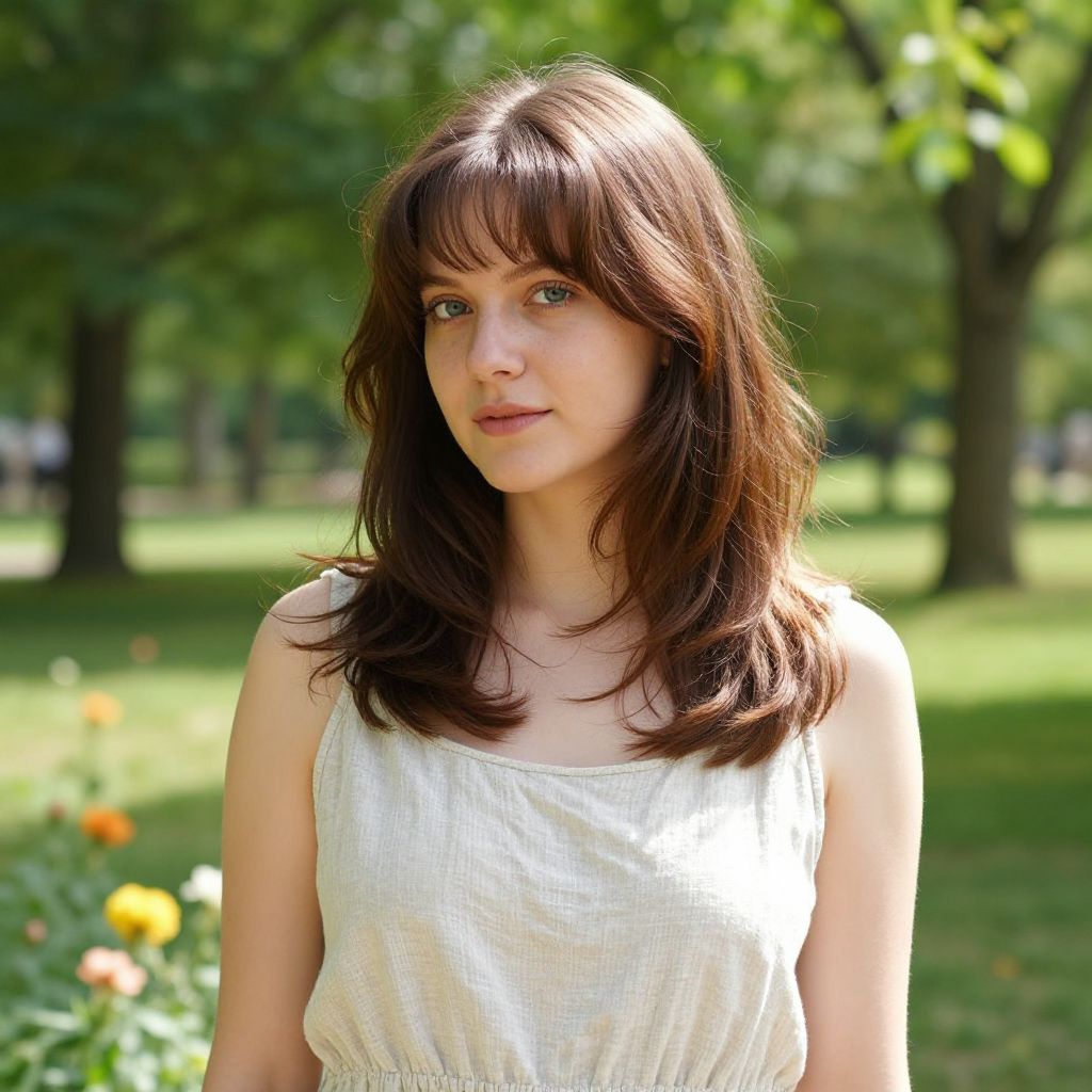 A realistic photograph of a young woman with bright hazel eyes and fair skin, standing in a quiet park near a stone fountain, smiling gently as she petts a playful tortoise-shell cat with patches of orange and charcoal gray fur, the cat's fur catching the morning light, and birds flying in the background.