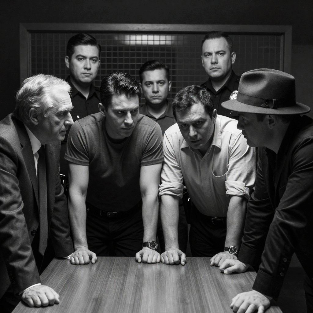 Black and white photograph of seven men in a tense meeting. Center, two men lean over a desk with documents. Left, older man in suit looks serious. Right, man in fedora leans in. Police officer in uniform stands behind. Background, metal mesh and dim lighting. Intense expressions, focused interactions.