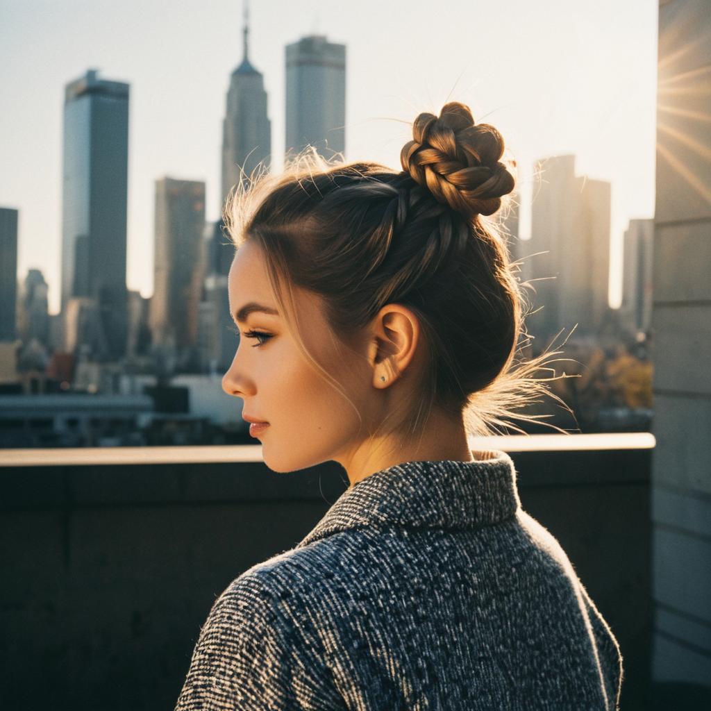 Braided Bun hairstyle on female model, wearing casual attire, in urban skyline, captured in fashion editorial style with warm sunlight.