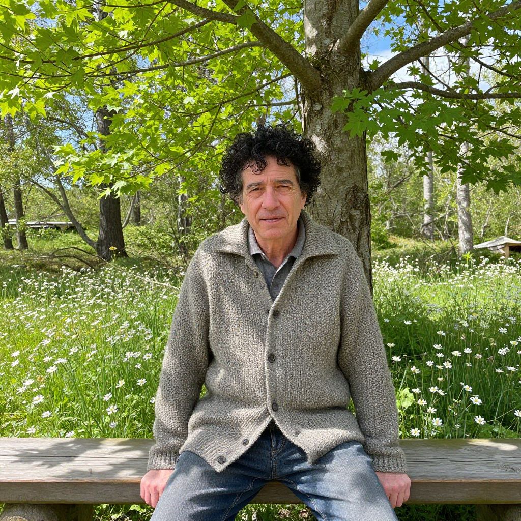 A vibrant outdoor scene in a Scandinavian forest during early spring, showing a man with kind, weathered face and curly black hair wearing an openknit jacket made of wool, sitting on a wooden bench under a wide maple tree, the jacket open at the front with visible knit details, surrounded by blooming wildflowers and sunlight filtering through the leaves.