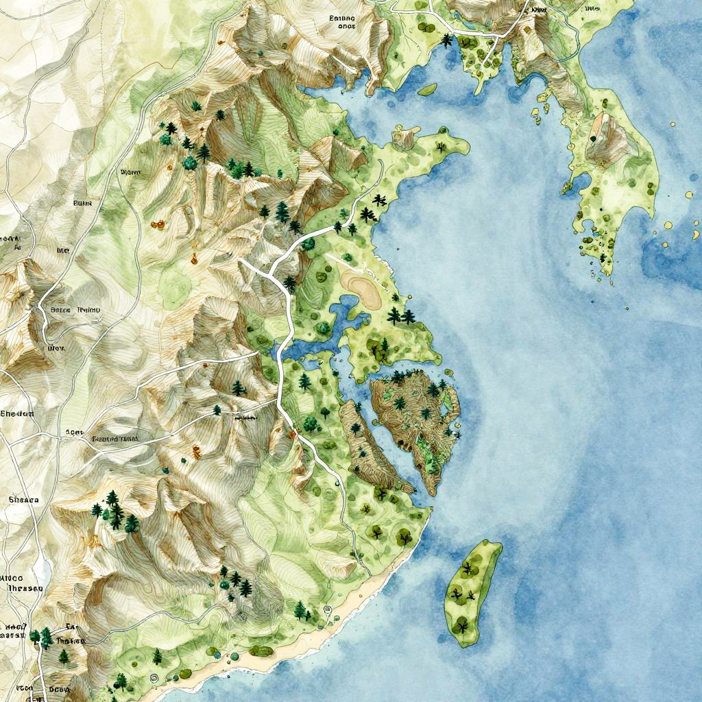 Map AI generator illustrating a detailed topographical map of a coastal region, showing cliffs, beaches, and underwater reef formations, soft watercolor style with pastel tones and lush greenery highlighting natural beauty.