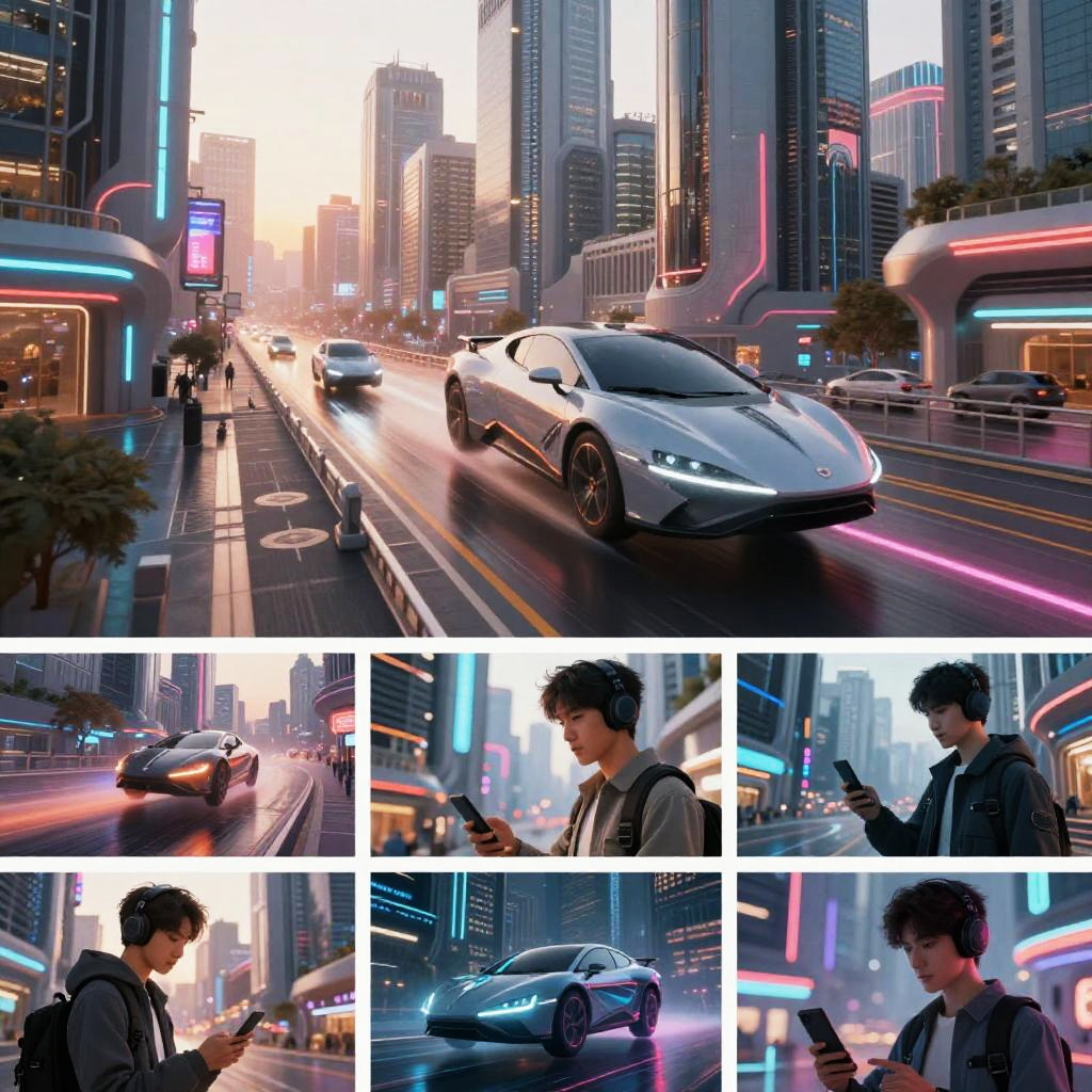 Midjourney storyboard featuring a neon-lit futuristic city at dawn with sleek flying sports cars on elevated roads. The collage includes dynamic panels showing a young man wearing headphones and using advanced smartphone technology amidst vibrant, detailed architectural designs and cinematic lighting effects.