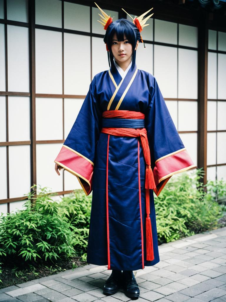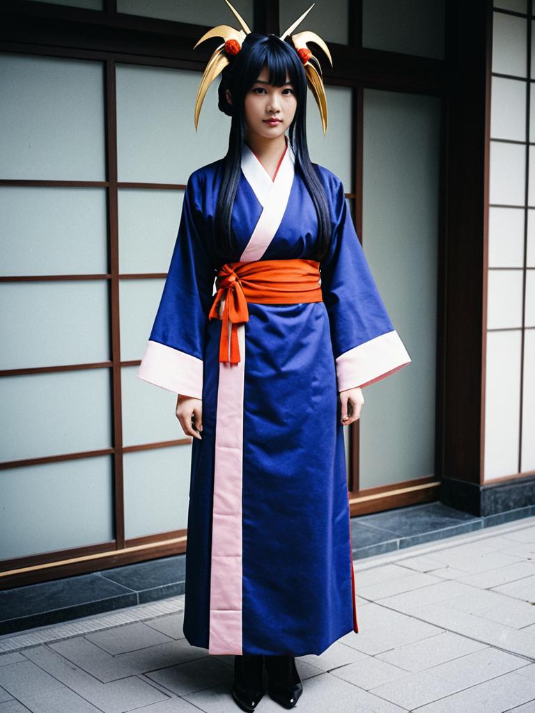 Photograph of an Asian woman in traditional Japanese cosplay attire standing indoors. She wears a dark blue kimono with white trim and a pink stripe down the front, tied with an orange obi sash. Her black hair is styled with yellow and white hair sticks. The background features a sliding shoji door with a light blue translucent panel and a dark wooden frame, and the floor is tiled in gray. The lighting is bright, highlighting the textures of her kimono and the background. She stands centered, looking directly at the camera with a neutral expression.
