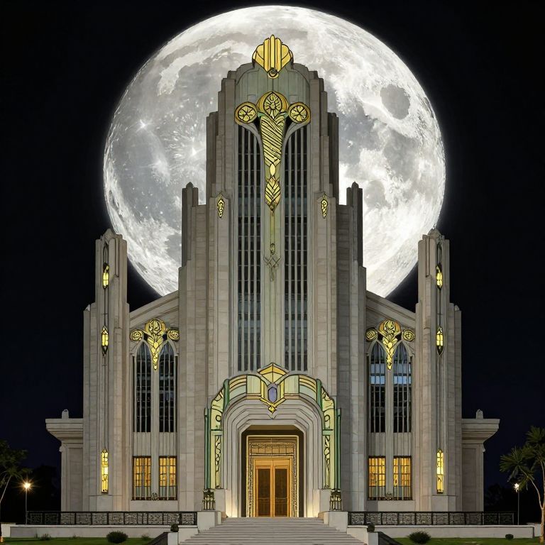 Photograph of a grand, Art Deco-style building illuminated by a large, bright full moon in the night sky. The building has a symmetrical, vertically-oriented design with tall, narrow windows and intricate golden decorative elements on the facade. The central entrance features a large, arched wooden door flanked by tall, narrow windows. The moon's radiant light casts a luminous glow on the building's gray stone exterior, enhancing the architectural details. The background is entirely black, emphasizing the contrast between the moon and the building. The scene is serene and dramatic, highlighting the architectural beauty and celestial alignment.