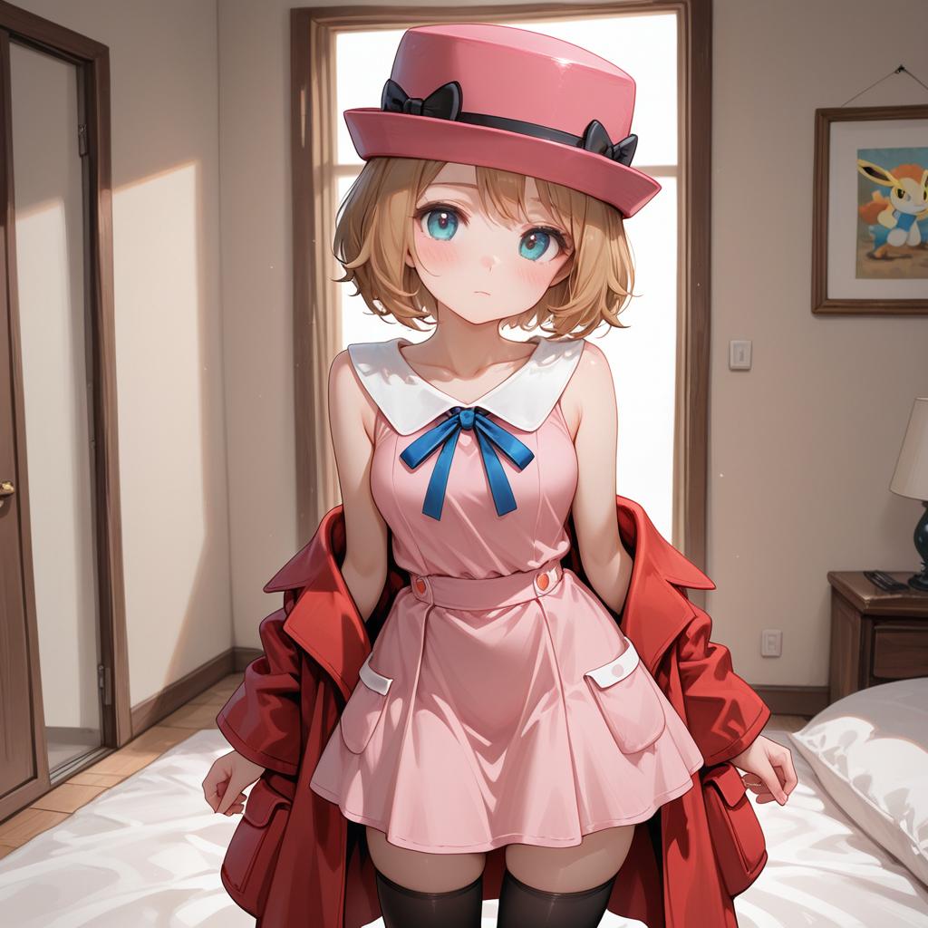 Masterpiece, best quality, highres, serena \(pokemon\), short hair, blue eyes, 1girl, solo, blue ribbon, eyelashes, black thighhighs, neck ribbon, sleeveless, bangs, collarbone, pink headwear, bare arms, pink dress, red coat, cowboy shot, indoors