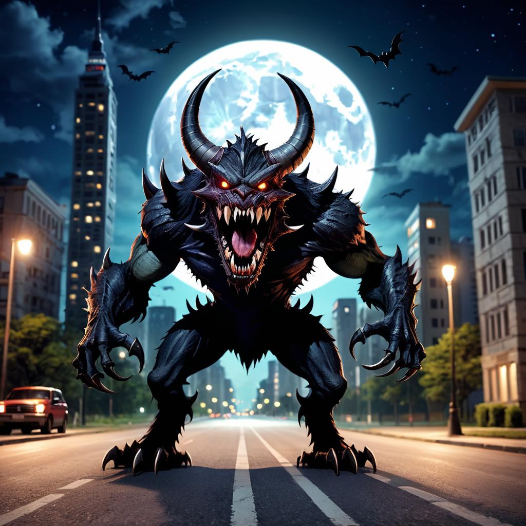 Night, no humans, outdoors, horror (theme), looking at viewer, lamppost, open mouth, blurry, teeth, horns, building, moon, standing, claws, road, monster, night sky, sharp teeth, solo, city, black eyes, fangs, realistic, motor vehicle, blurry background