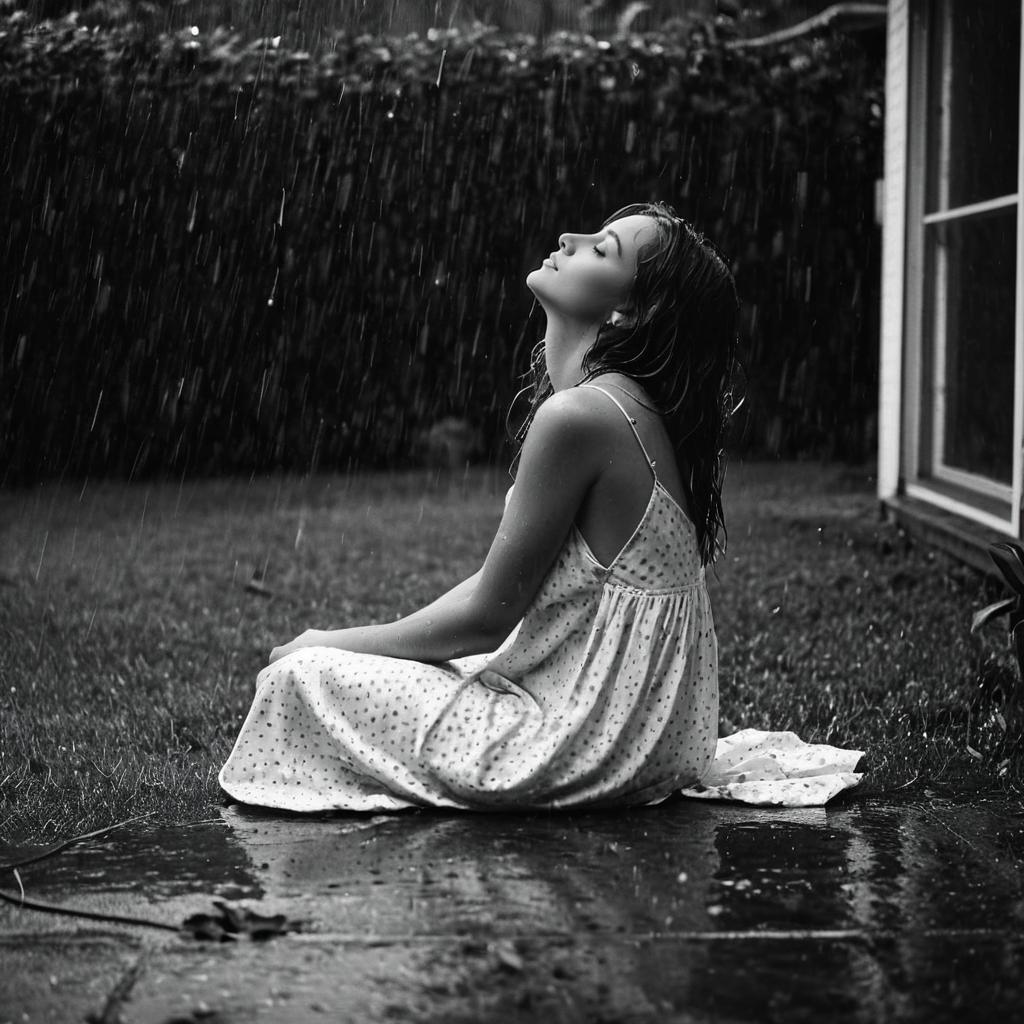 Black and white photo of a young woman sitting on the ground in her backyard during a rainstorm. She is wearing a silky nightgown with thin straps, her hair and clothes are wet. The woman is shown in profile with her head tilted back and eyes closed, enjoying the rain. The image captures rain falling with a long exposure effect, with visible puddles on the wet pavement and grass.