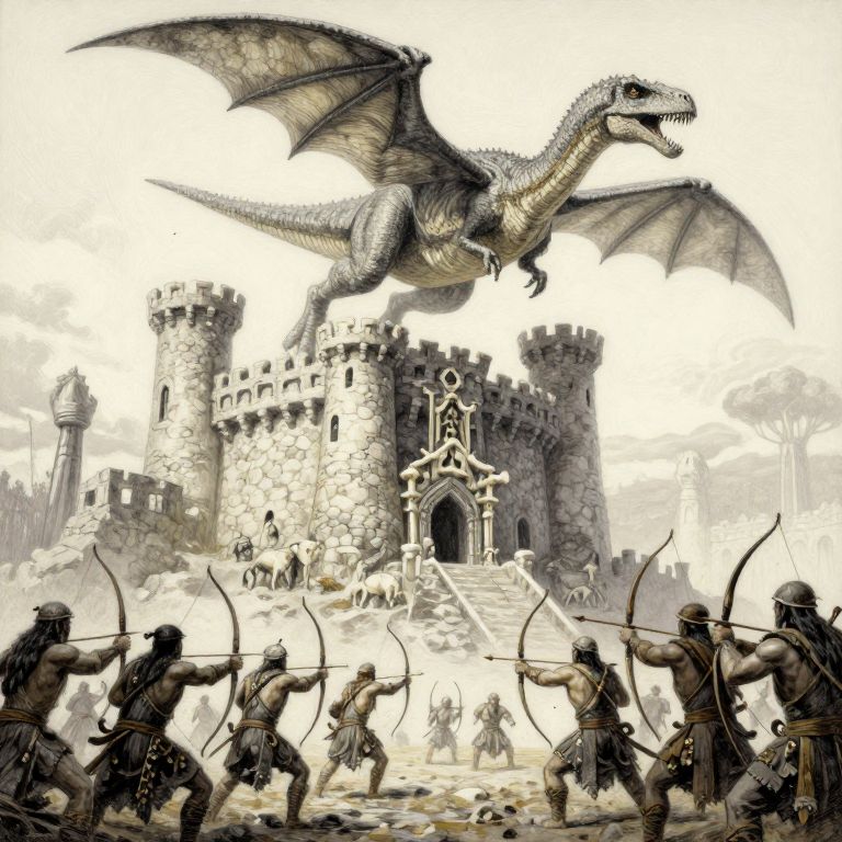 Oil painting with illustration fineliner work, drawing of ancient barbaric bone and stone castle with flying dinosaur above, tribe of warriors ready for battle with the beast, archers aiming upwards, OByouhua DRK