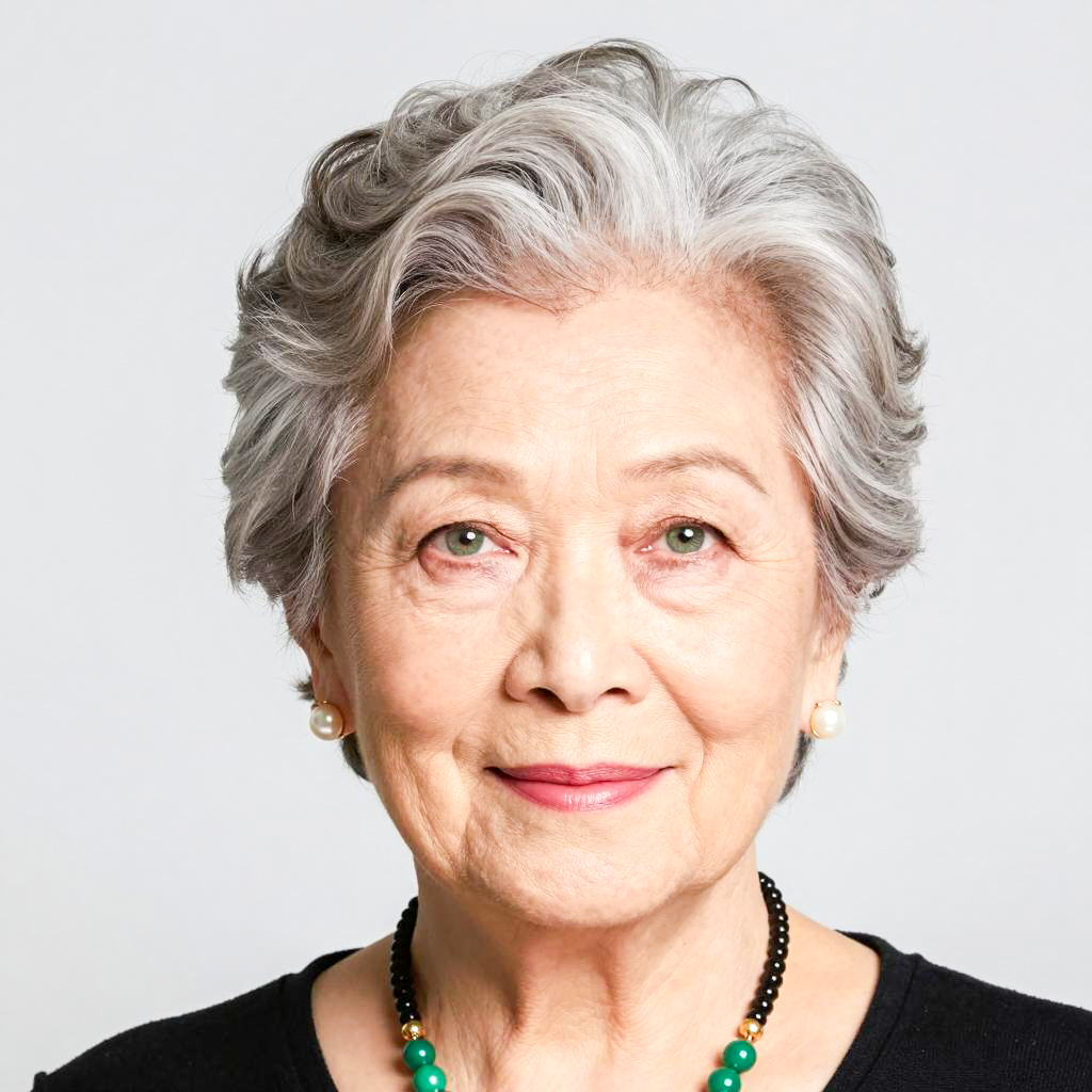 Grey granny hairstyle, photograph of elderly woman, short gray hair, neatly styled, light skin, green eyes, pink lipstick, wearing black top, pearl earrings, green and gold necklace, black choker, plain light gray background, portrait, realistic style, front view, slight smile, close-up