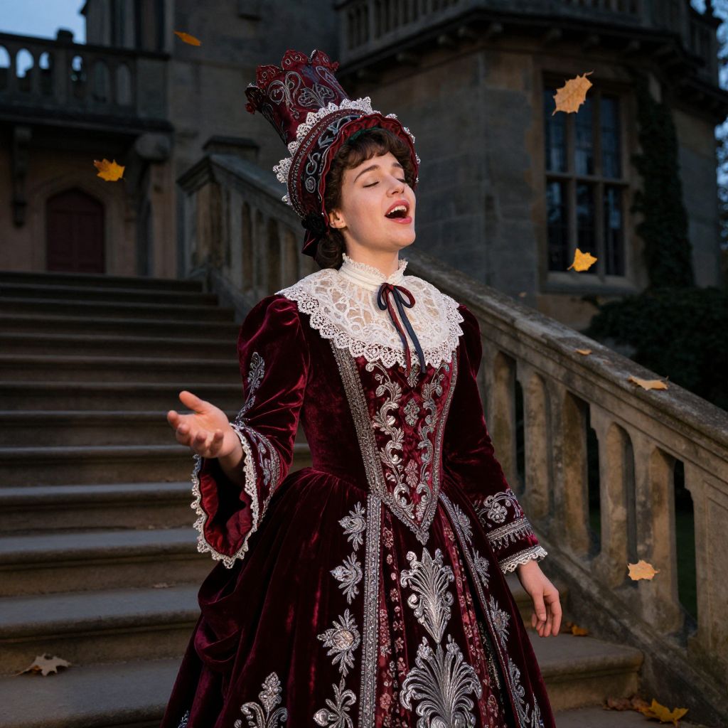 A lifelike portrait of a stunning Victorian carol singer in a richly embroidered costume featuring a deep crimson velvet dress with silver embroidery, a lace collar, and a tall, ornate bonnet, positioned on a stone staircase inside a historic country manor at dusk, with autumn leaves falling softly around her, her face glowing with warm expression and genuine emotion, eyes closed in a moment of heartfelt singing