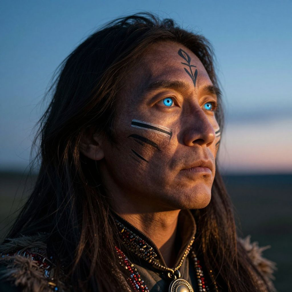 Photograph of a Native American man with long black hair, blue eyes, tribal face paint, and a fur-lined jacket, gazing into a twilight
