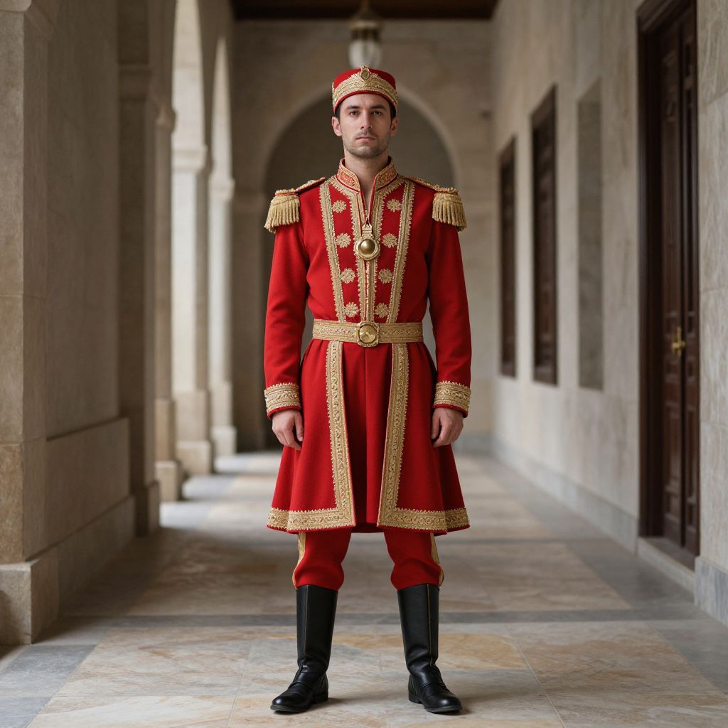 Ottoman Soldier Costume, man in a red and gold outfit standing in a hallway