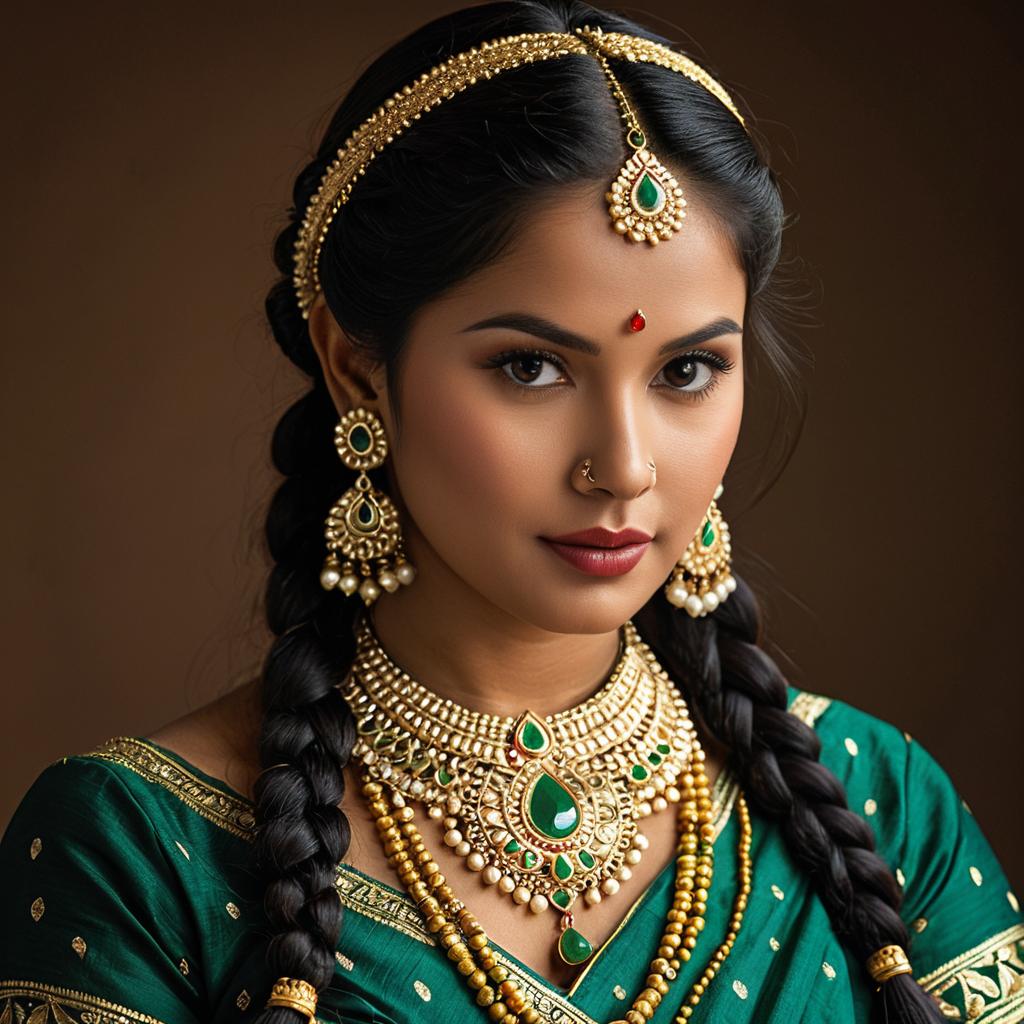 Nagada sang dhol dance dress, photograph of a beautiful Indian woman, traditional wedding attire, orange and red saree with green and gold patterns, short crop top, long hair with red veil, ornate jewelry including necklace, earrings, and maang tikka, medium skin tone, confident expression, standing pose, blurred background of steps, daytime lighting, high detail, realistic style