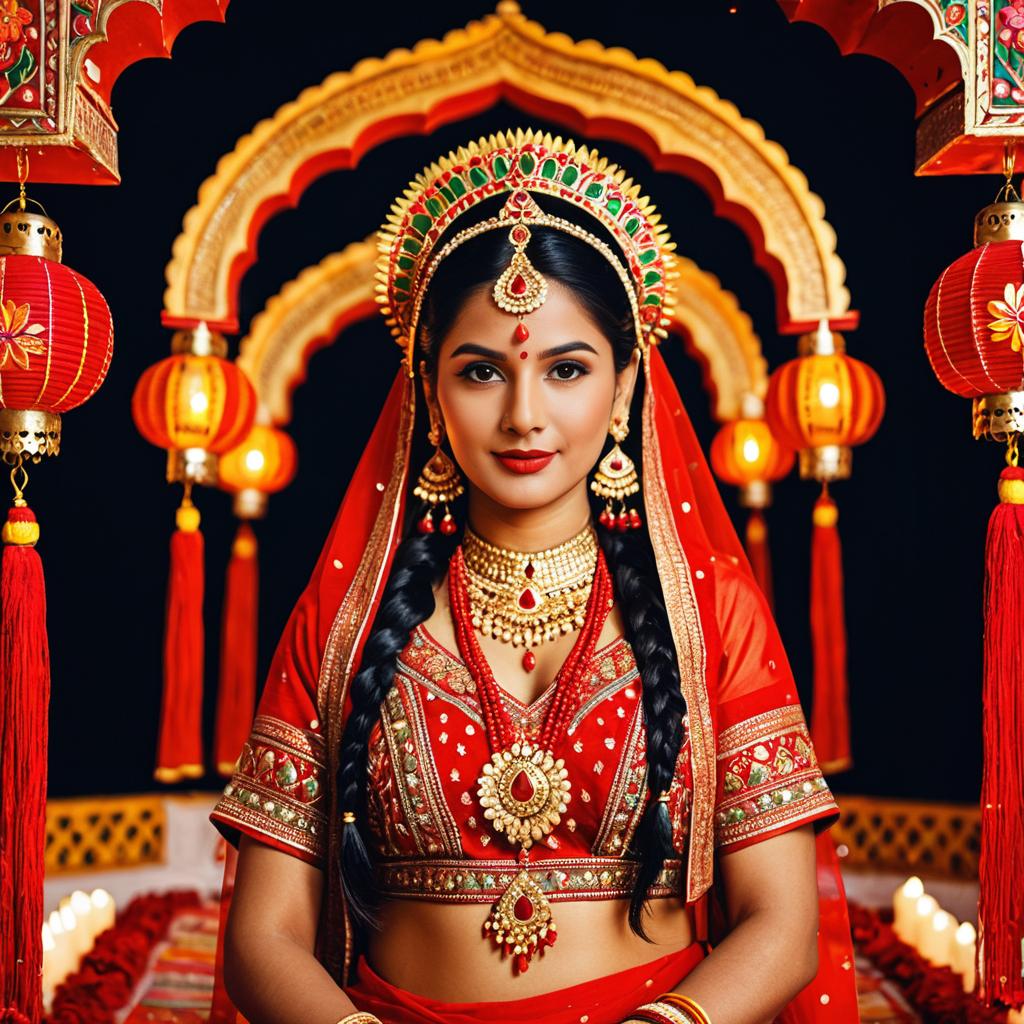 Photograph of a beautiful Indian woman wearing traditional wedding attire featuring an orange and red lehenga choli with green and gold embroidery. She has a red veil over her long black hair and is adorned with elaborate gold jewelry including a necklace, earrings, bangles, and maang tikka. The woman has a medium skin tone and a confident expression. The background shows blurred steps and greenery, indicating an outdoor daytime setting.