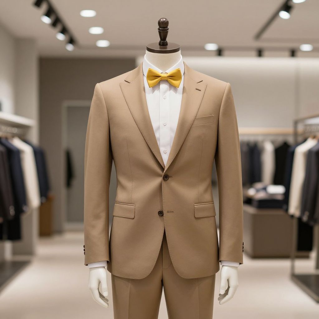 A mannequin wearing a tan suit with a white shirt and a yellow bow tie, standing in a modern retail store with a sleek, minimalist interior, under soft artificial lighting, with a professional and stylish appearance, emphasizing the sharp lines and clean design of the clothing, the mannequin's pose is upright and confident, conveying a sense of sophistication and elegance, the background is a neutral color palette with subtle textures to enhance the overall aesthetic of the image.