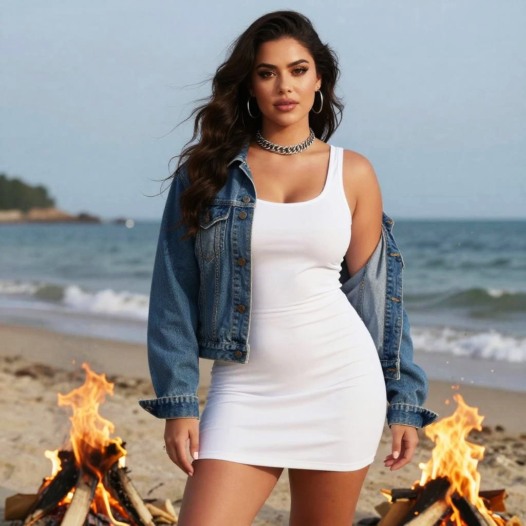 Photograph of a curvy woman with long dark hair, wearing a white tank dress and denim jacket, standing by a beach fire, ocean in background