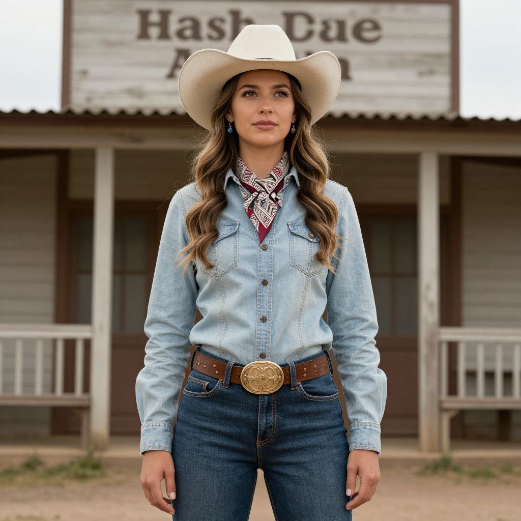 Photograph of a young woman with long brown hair, wearing a white cowboy hat, light blue denim shirt, patterned scarf, and high-wa