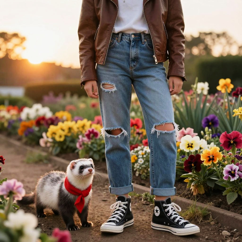 A teenager in a vintage leather jacket and ripped jeans wearing black Converse high-tops explores a vibrant garden filled with colorful flowers at sunset. A playful silver tabby ferret wearing a tiny red scarf accompanies her, adding charm to the scene.