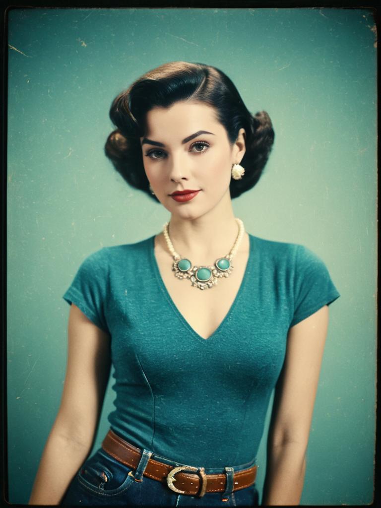 Portrait of a young woman with a vintage hairstyle wearing a teal V-neck short sleeve top tucked into blue denim jeans. She accessorizes with a statement necklace featuring turquoise stones and pearl accents, and matching earrings. The image has a retro aesthetic with a lightly distressed frame effect.