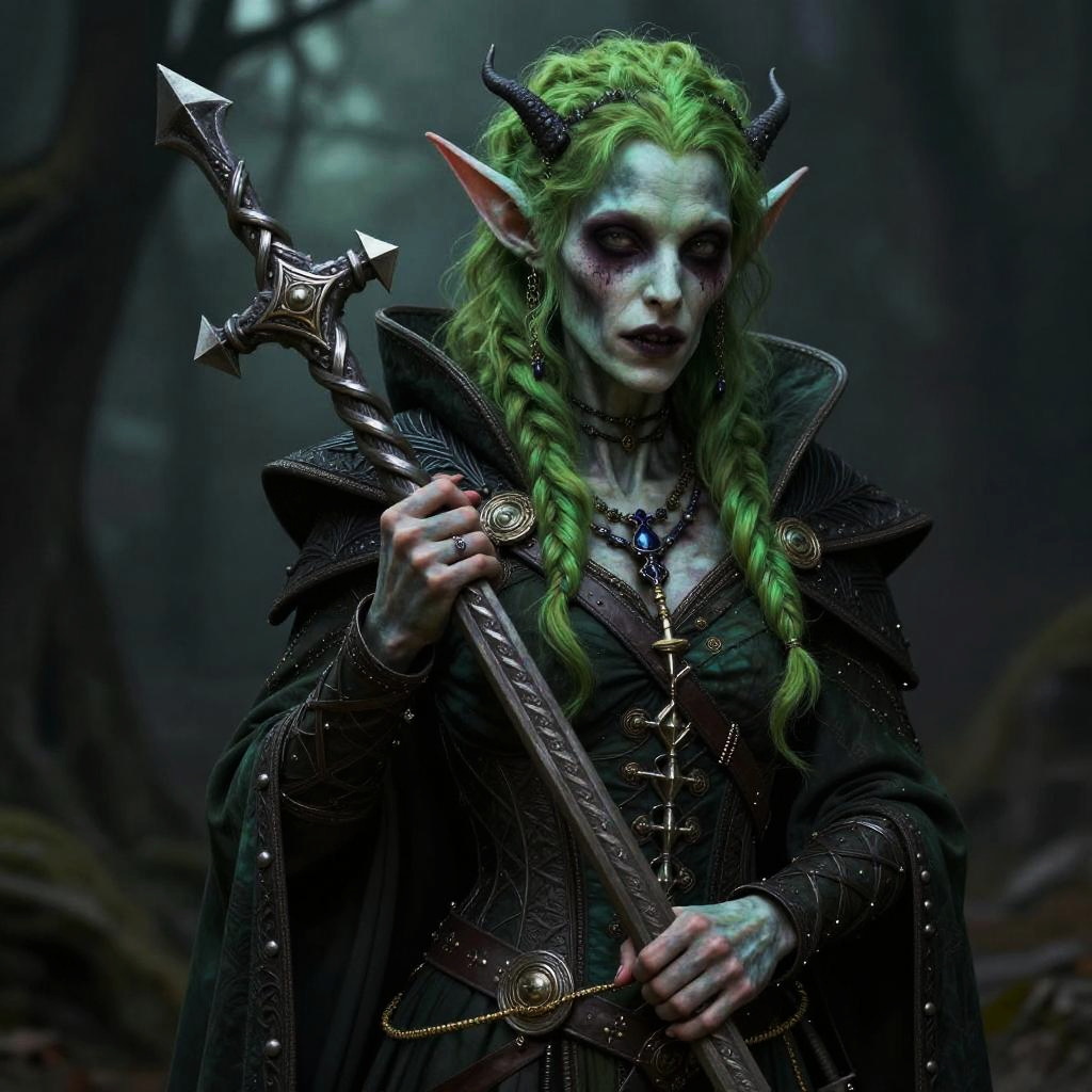 A realistic photo of a twisted tiefling bard character inspired by D&D fantasy art. The figure has pale green skin, long vibrant green braided hair, black horns, pointed elf-like ears, and dark gothic makeup around the eyes. The character wears intricate dark green and black flamboyant garb with detailed leather and metal accents, including a corset and a cape. They hold a large ornate staff with a cross-shaped top in a forest setting, conveying a deep feeling of isolation and madness.